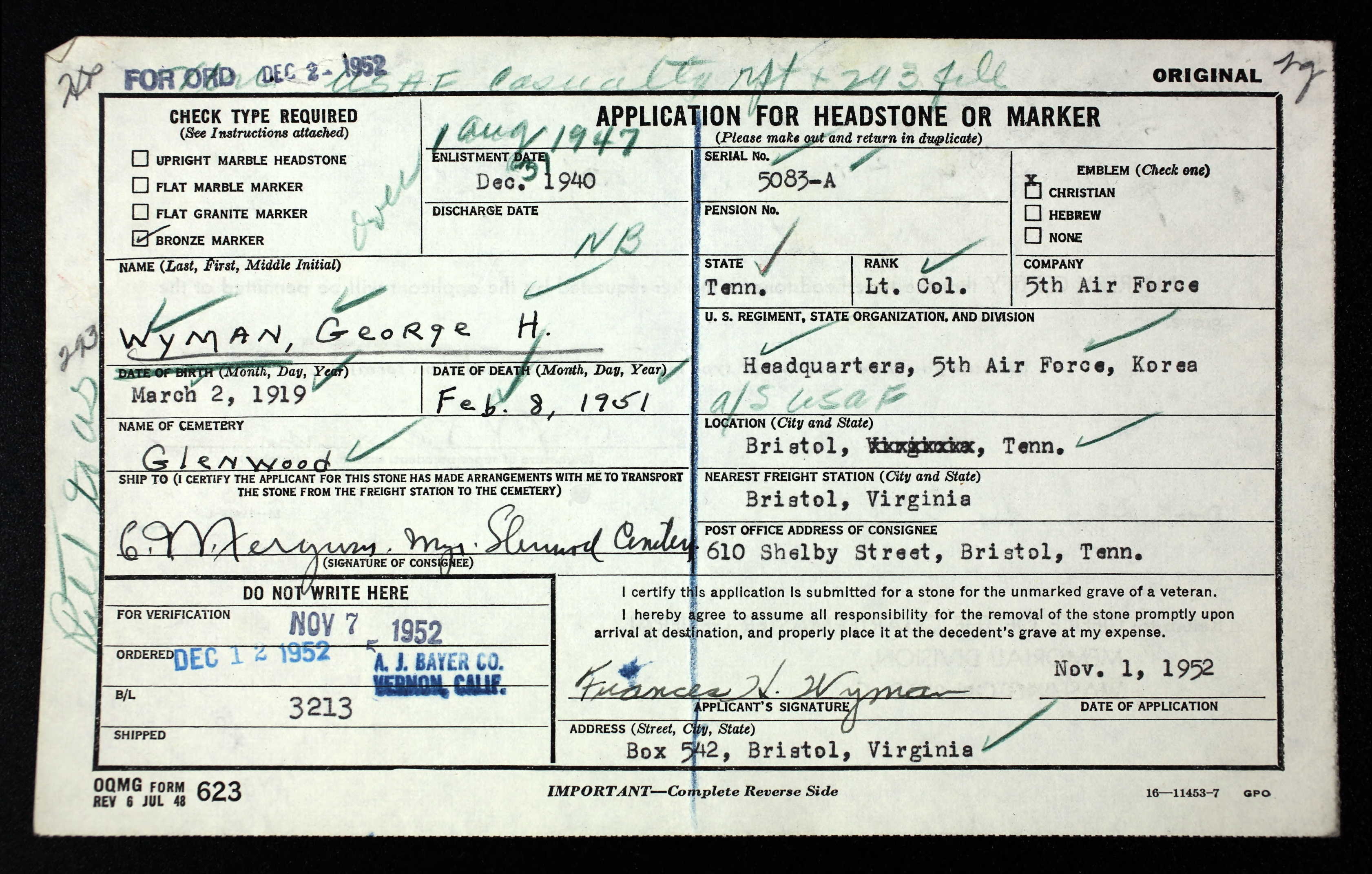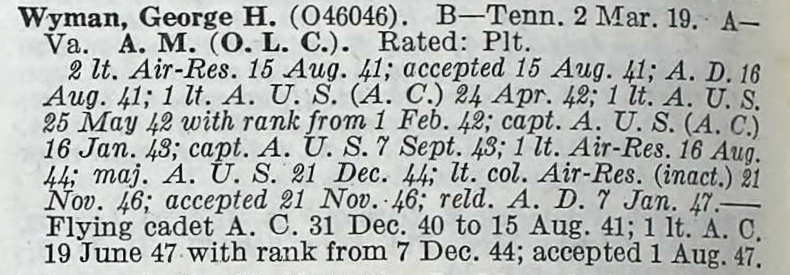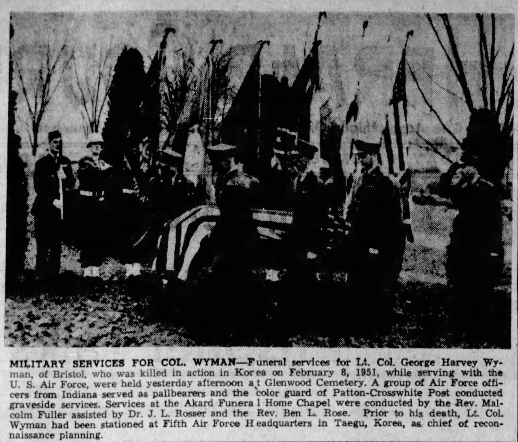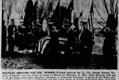 Lieutenant Colonel George Harvey Wyman was a member of Headquarters and Headquarters Squadron, 5th Air Force. On February 8, 1951, while flying in a C-45 Beech Navigator, as it tried to land at Taegu Airfield #2 (K-37), it ran out of fuel and crashed killing him and a passenger.