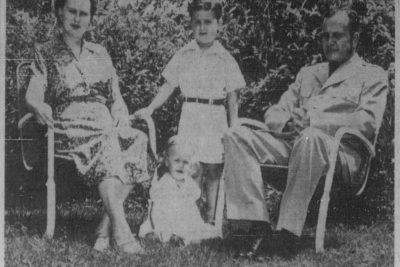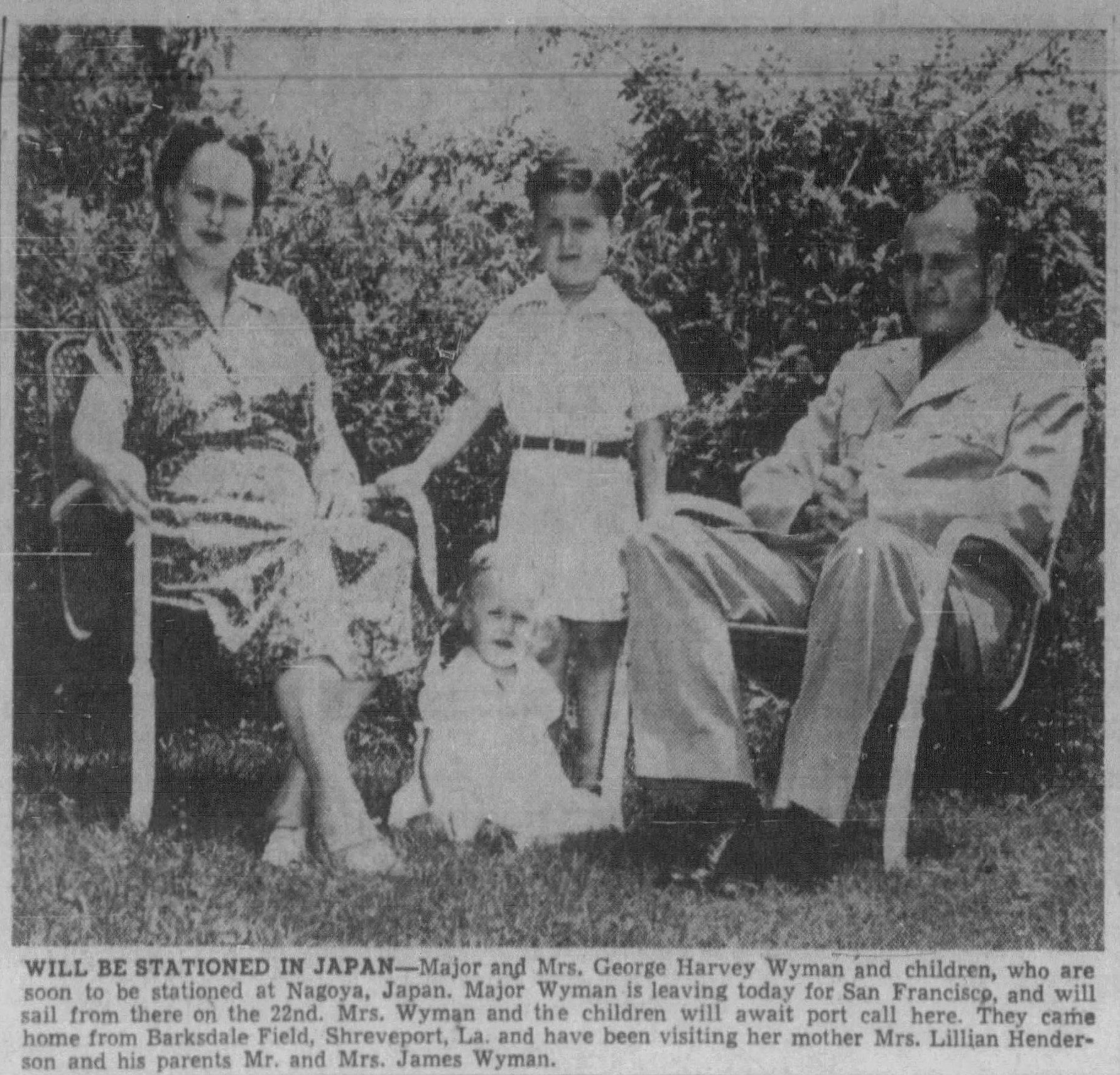 Major and Mrs. George Harvey Wyman and children, who are soon to be stationed at Nagoya, Japan. Major Wyman is leaving today for San Francisco and will sail from there on the 22nd. Mrs. Wyman and the children will await port call here. They came home from Barksdale Field, Shreveport, La. and have been visiting her mother Mrs. Lillian Henderson and his parents Mr. and Mrs. James Wyman.