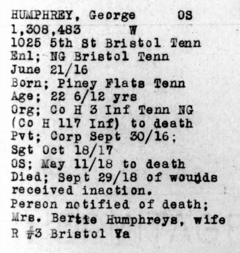 George Humphrey was born in Piney Flat, Tennessee. He married Bertie Polly Odle in 1917. Cpl Humphrey died of wounds received in action on 29 September 1918 in France.