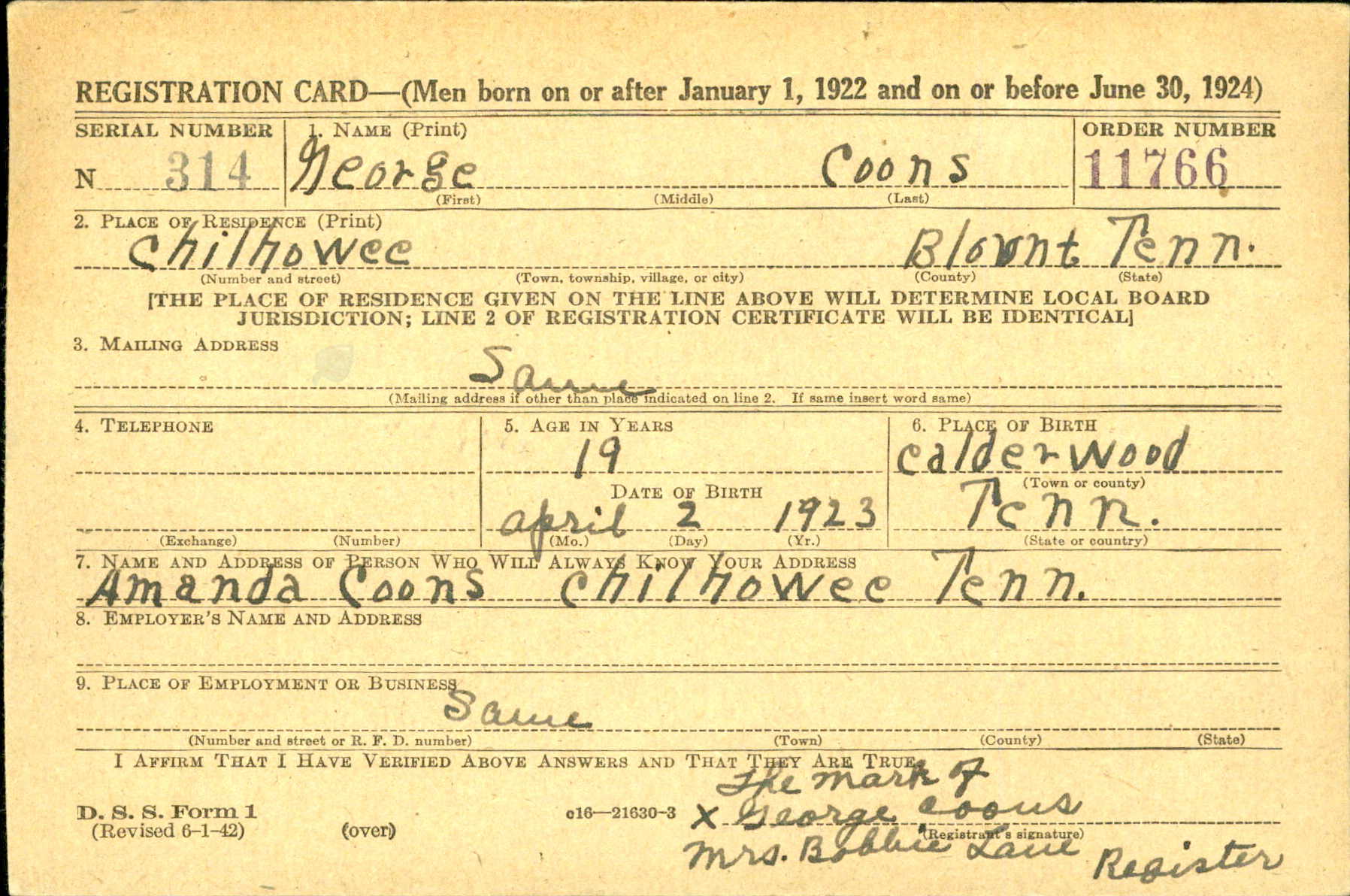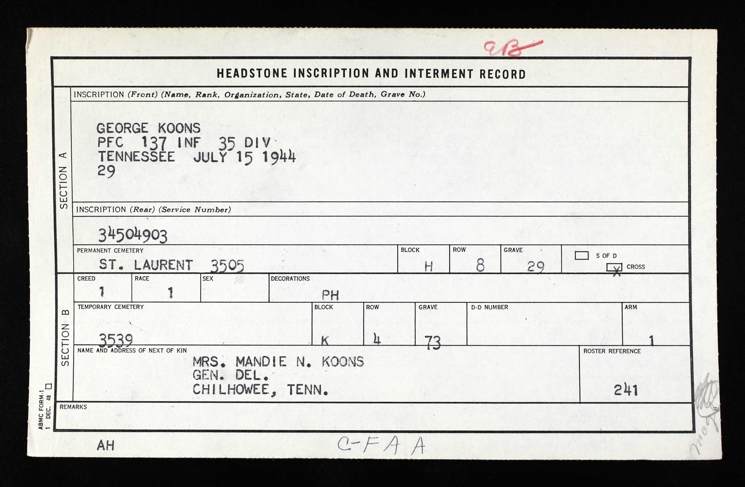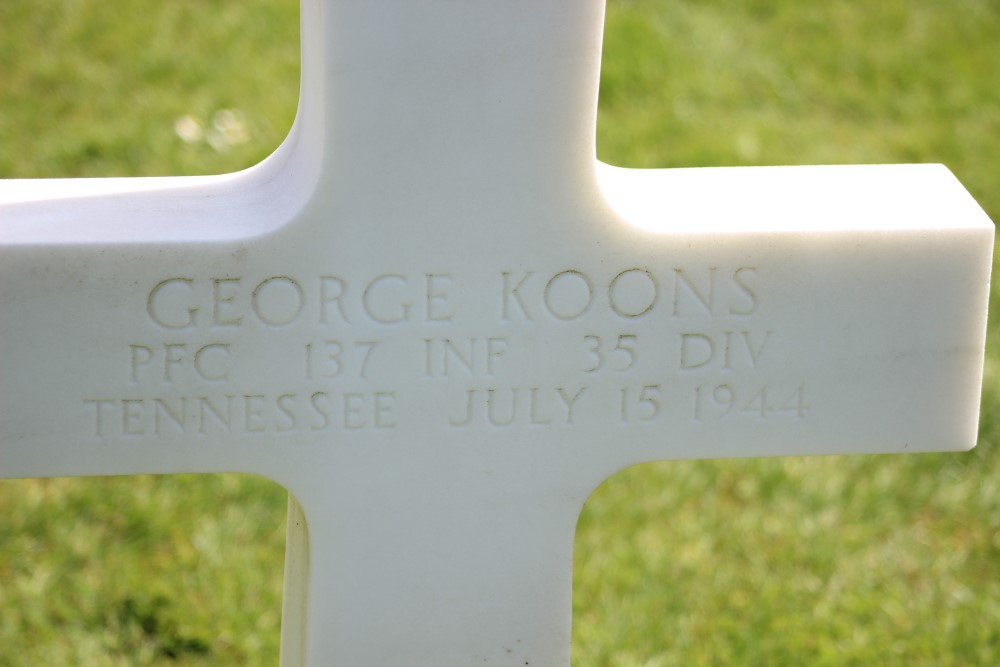 Private First Class George Koons was born at Calderwood, Tennessee, the son of Amanda Nichols and the brother of Lenna Koons, Albert Koons, Gabe Koons, and Lonnie Koons. He enlisted in the military on January 9, 1943, in Fort Oglethorpe, Georgia. He served in the European Theater of the war in the 137th Infantry Regiment, 35th Infantry Division. He was killed in action on Saturday, July 15, 1944. He was initially buried at La Cambe Cemetery at Isigny, France and re-buried at the Normandy American Cemetery in Colleville-sur-Mer, France (Plot H, Row 8, Grave 29).