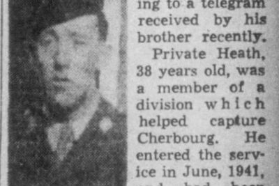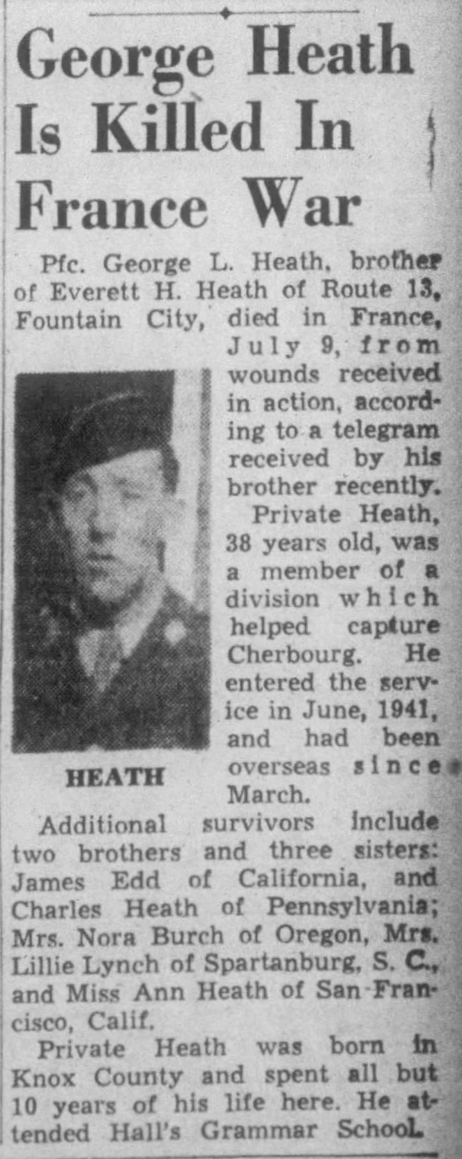 Pfc. George L. Heath, brother of Everett H. Heath of Route 13, Fountain City, died in France, July 9 from wounds received in action, according to a telegram received by his brother recently. Private Heath, 38 years old, was a member of a division which helped capture Cherbourg. He entered the service in June, 1941, and had been overseas since March.