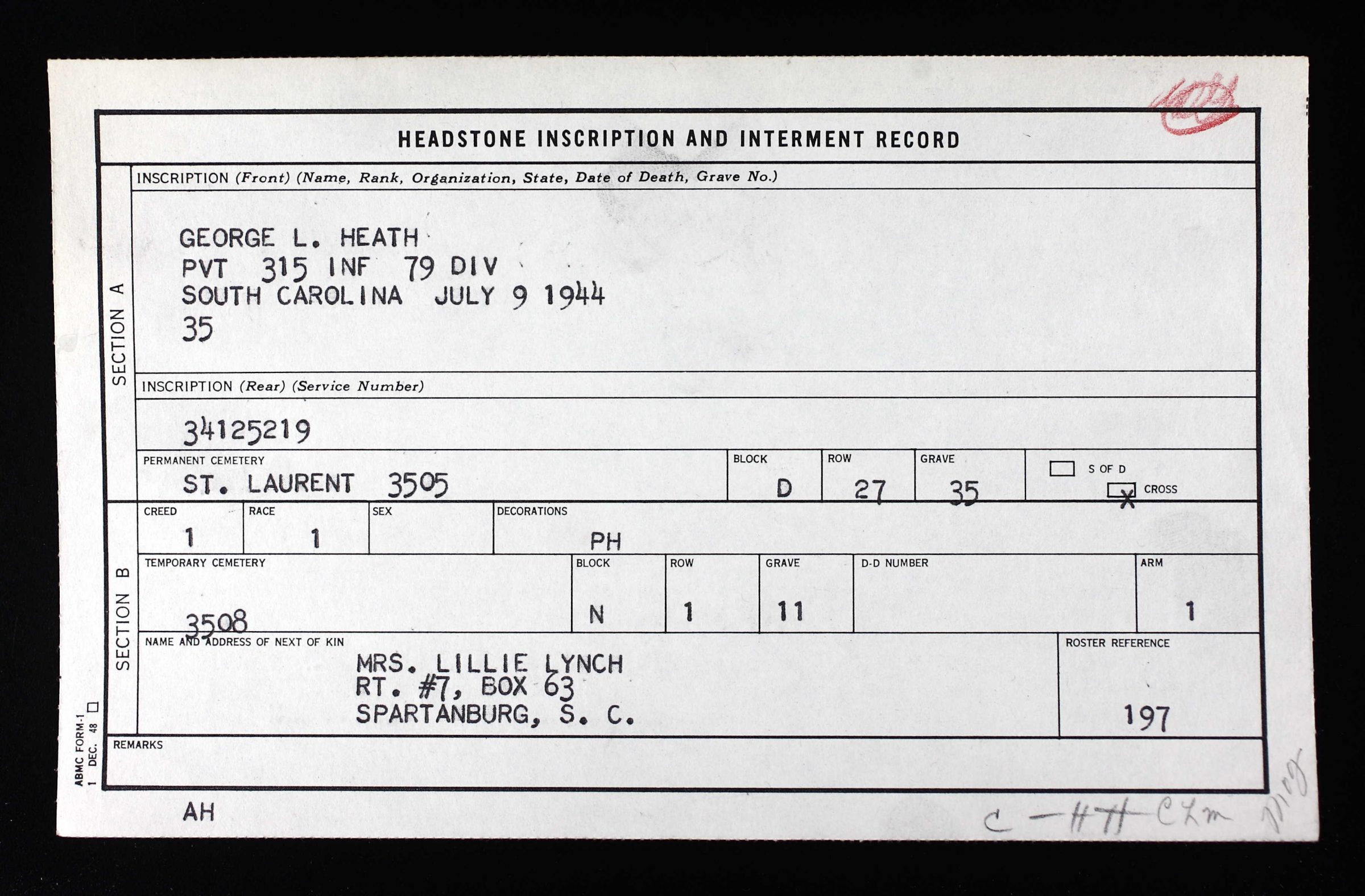 Additional survivors include two brothers and three sisters: James Edd of California and Charles Heath of Pennsylvania; Mrs. Nora Burch of Oregon, Mrs. Lillie Lynch of Spartanburg, S.C., and Miss Ann Heath of San Francisco, Calif. Private Heath was born in Knox County and spent all but 10 years of his life there. He attended Hall’s Grammar School.