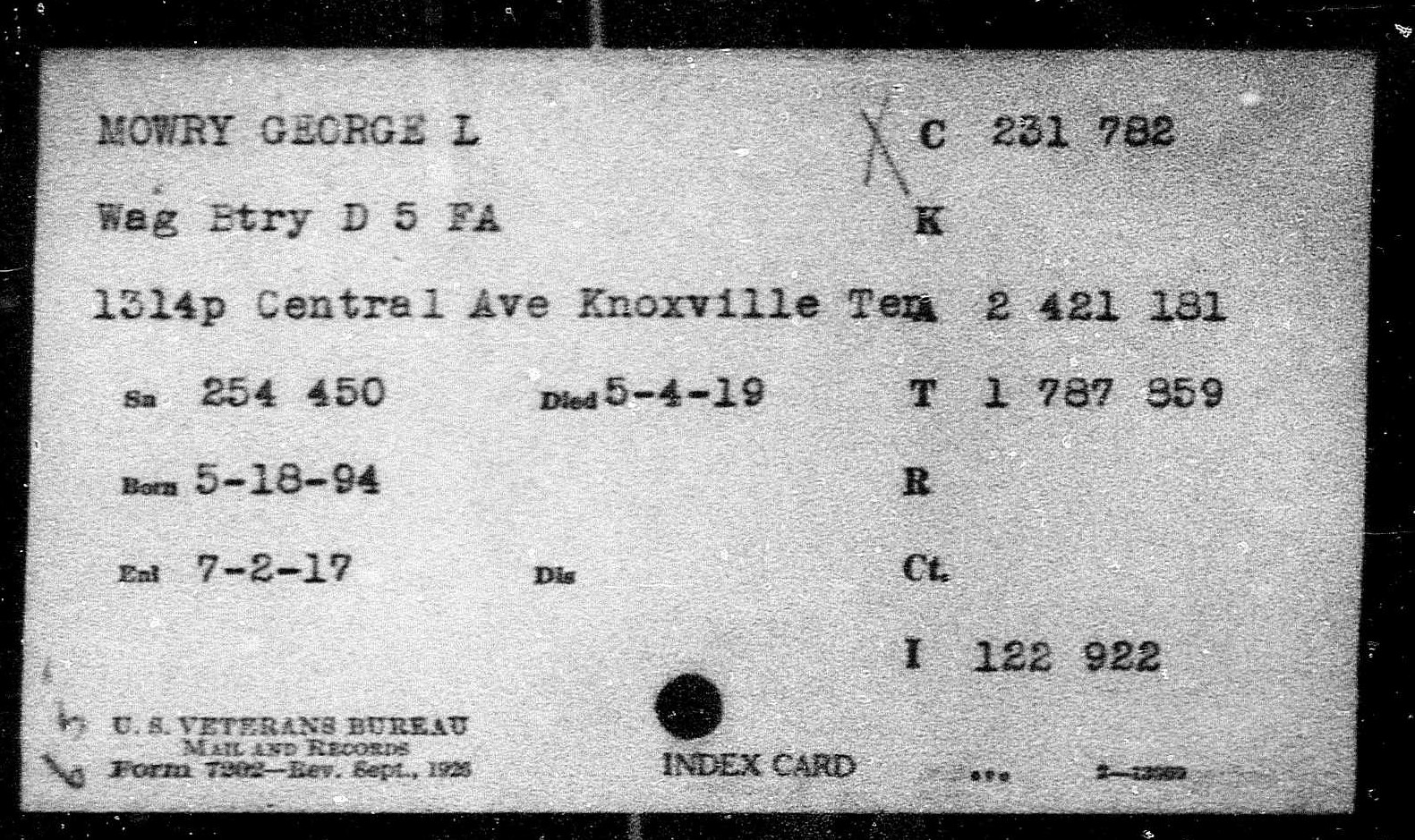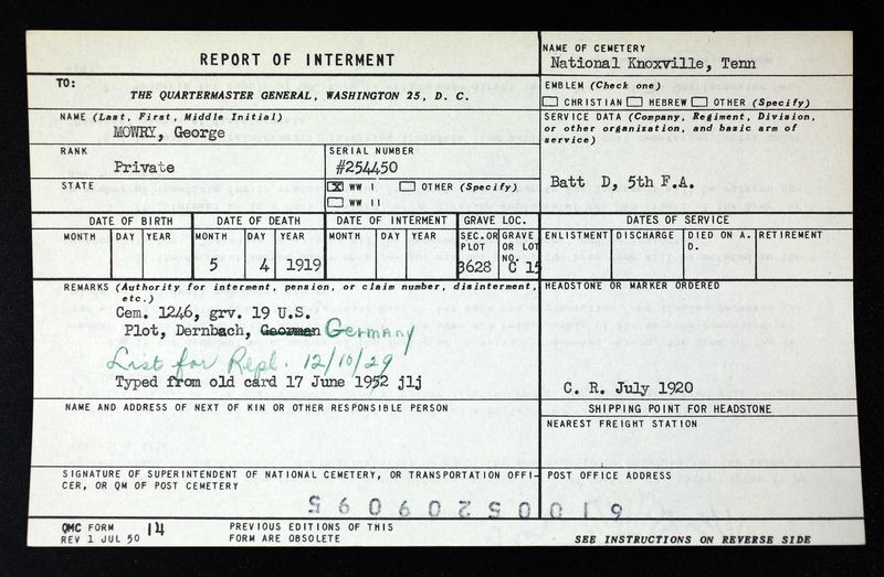 Pvt Mowry was initially buried at Dernbach, Germany. He is buried at Knoxville National Cemetery, 3628, C15.