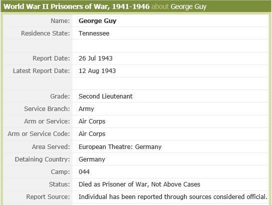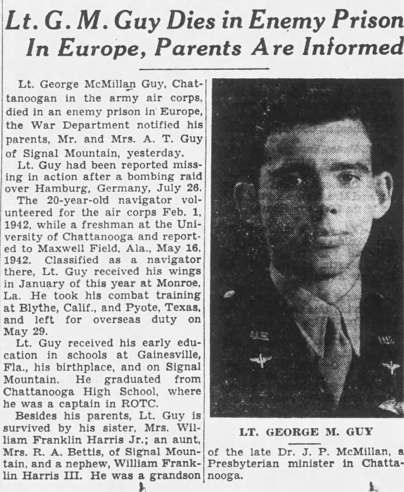 Lt. George McMilland Guy, Chattanoogan in the army air corps, died in an enemy prison in Europe, the War Department notified his parents, Mr. and Mrs. A.T. Guy of Signal Mountain, yesterday.
