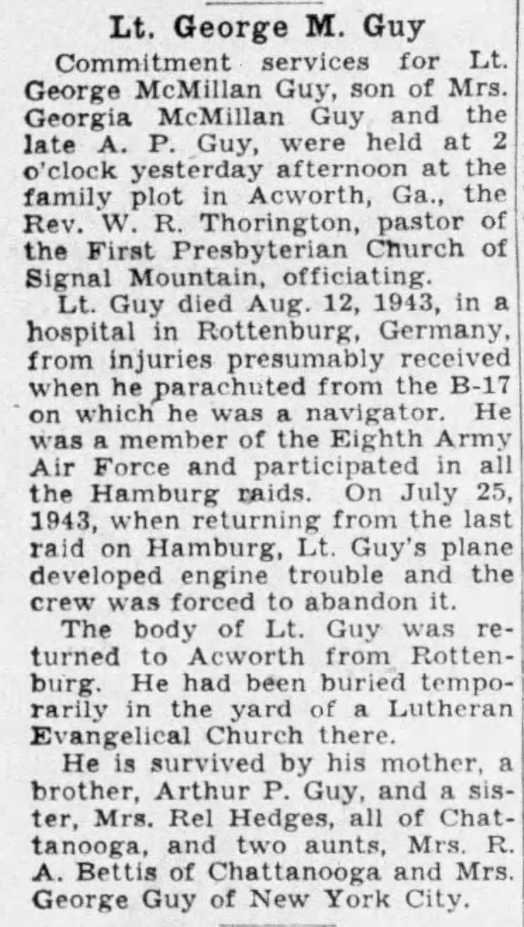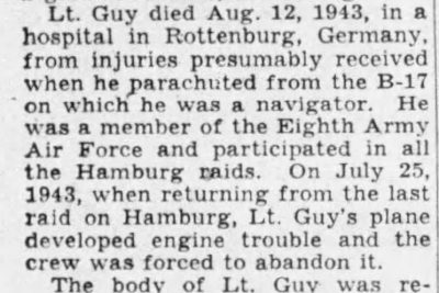 Lt Guy Bailed out of the nose hatch, apparently uninjured. Lt. Guy died in a hospital in Rottenburg, Germany, from injuries presumably received when he parachuted from the B*17 on which he was a navigator. He participated in all the Hamburg raids.