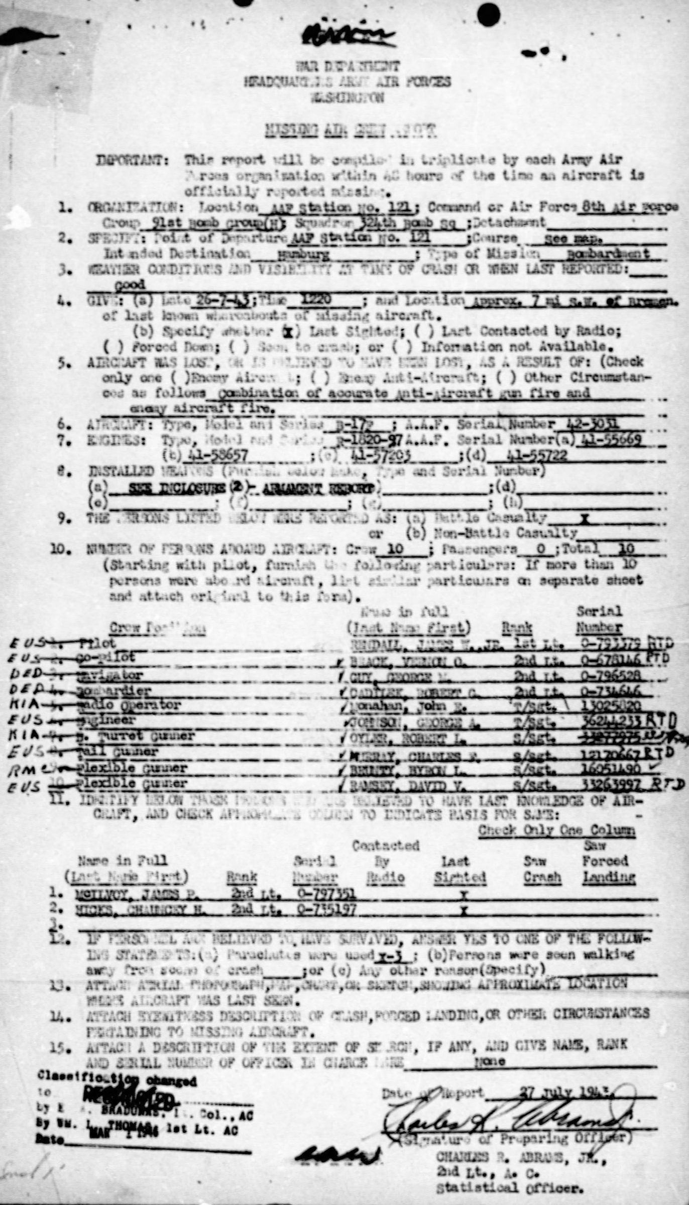 The A/C was last definitely identified by crew members of A/C 679, which was the last A/C of the entire formation, a few miles southwest of Bremen on a course that would have allowed it to cross the enemy coast just southwest of Bultrum Island. It was at 3,000 feet and slowly losing altitude with three enemy aircraft attacking it. Only three parachutes were seen to come from this aircraft by the two officers who last sighted it, 2nd Lt James F. McIlvoy and 2nd Lt. Chauncey H. Hicks. The aircraft crashed near Niendorf, Germany, south of Hamburg.