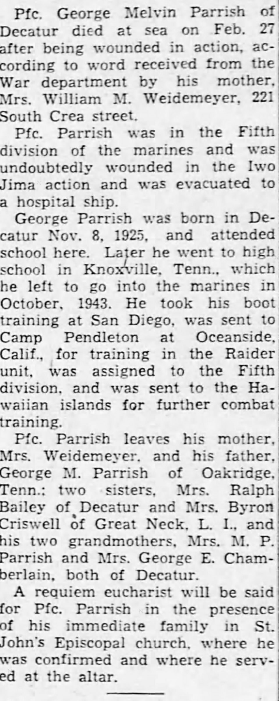 Pfc. Parrish was in the Fifth division of the marines and was undoubtedly wounded in the Iwo Jima action and was evacuated to a hospital ship. George Parrish was born in Decatur Nov. 8, 1925, and attended school here. Later he went to high school in Knoxville, Tenn., which he left to go into the marines in October, 1943. He took his boot training at San Diego, was sent to Camp Pendleton at Oceanside, Calif., for training in the Raider unit, was assigned to the Fifth division, and was sent to the Hawaiian islands for further combat training.