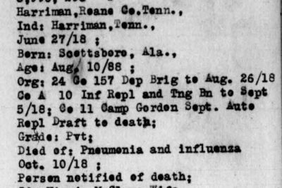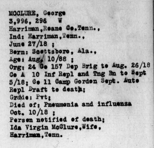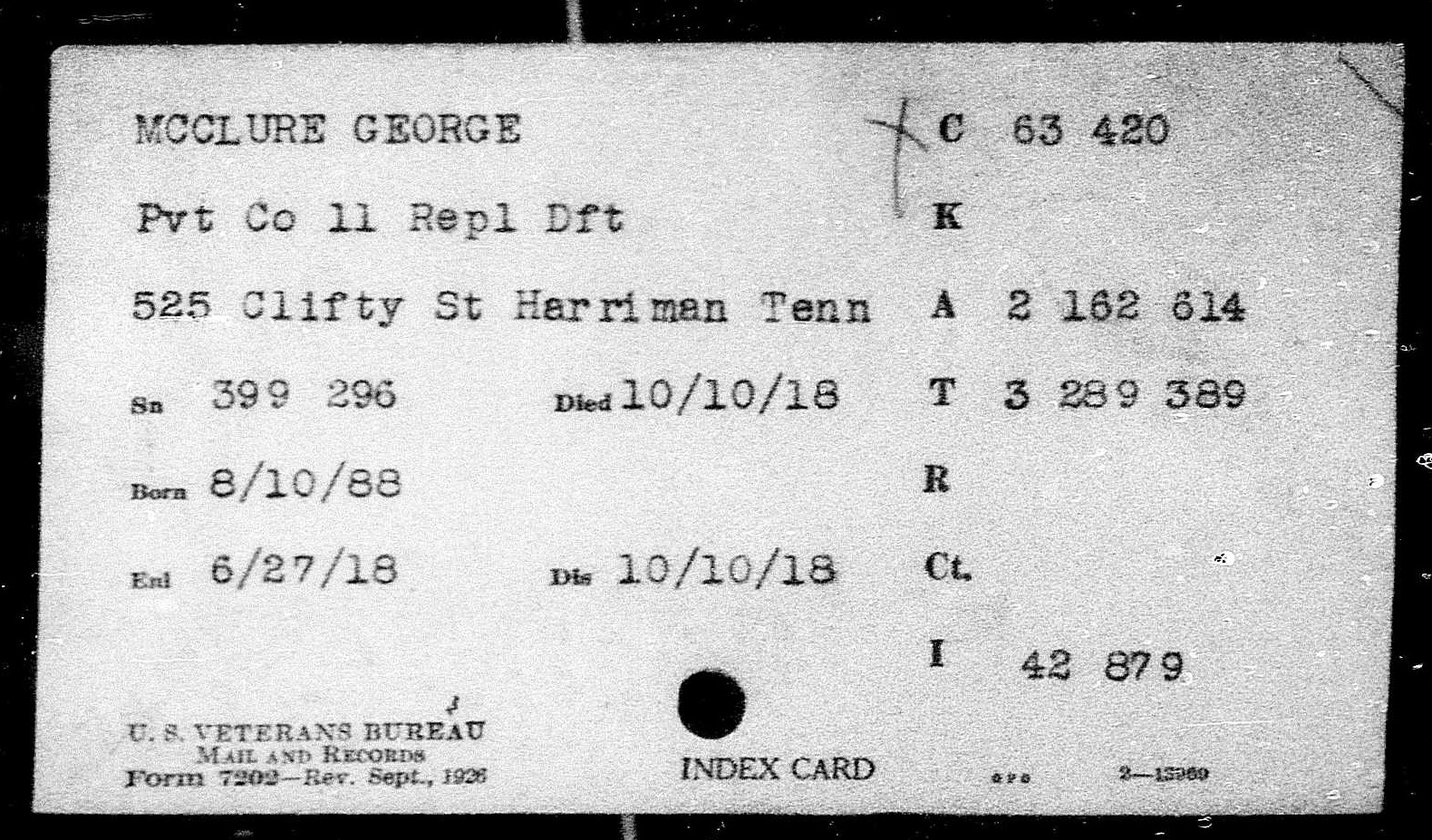 George McClure was born 16 August 1888. He enlisted in the U.S. Army June 1918. Pvt McClure died on 10 October 1918 of pneumonia and influenza.
