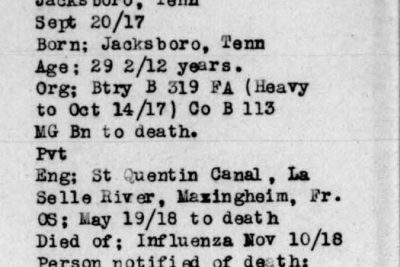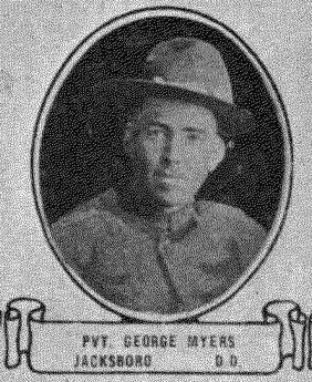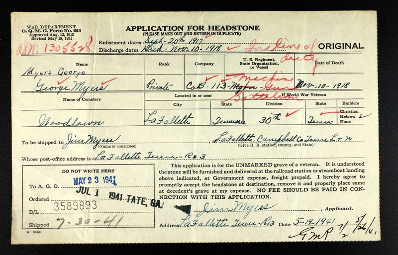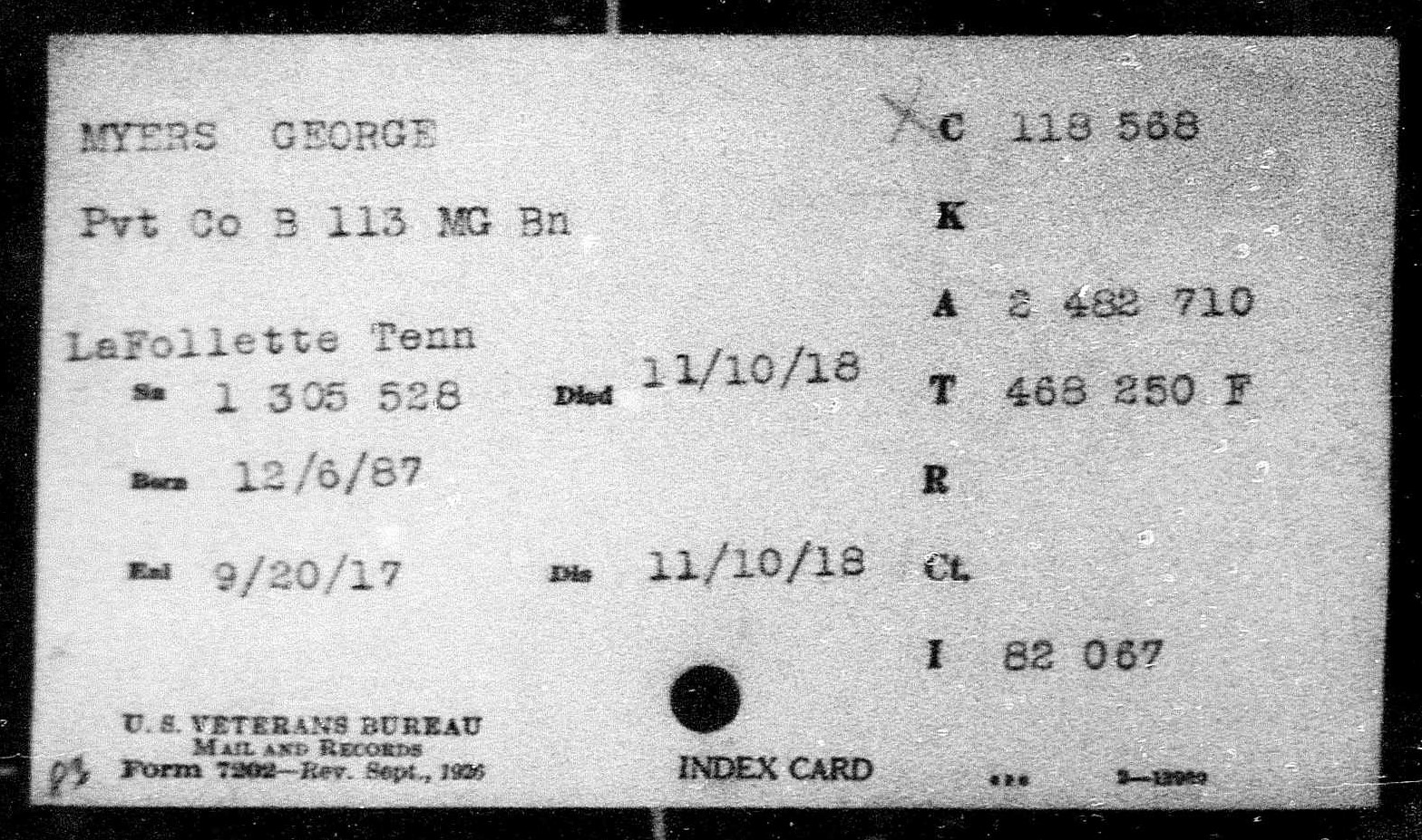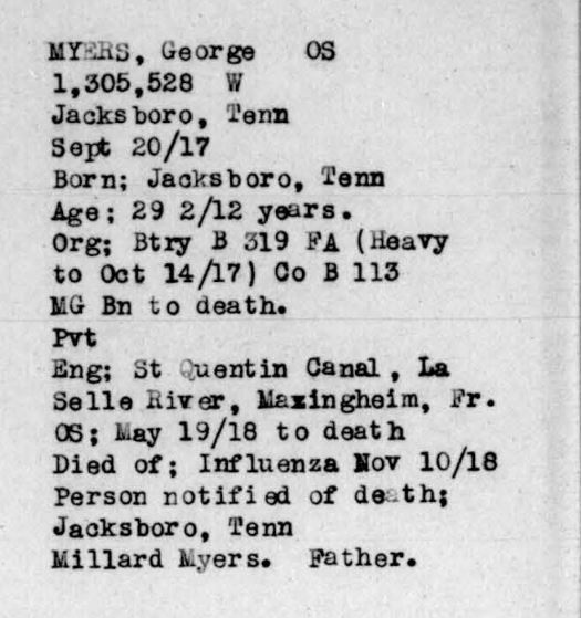 George Myers was born in Jacksboro, Tennessee, son of Millard Myers. Pvt Myers enlisted on 20 September 1917 at Camp Gorden, Chamblee, Georgia. He died of influenza at the age of 29 on 10 November 1918. Buried at Woodlawn Cemetery, LaFollette, TN.
