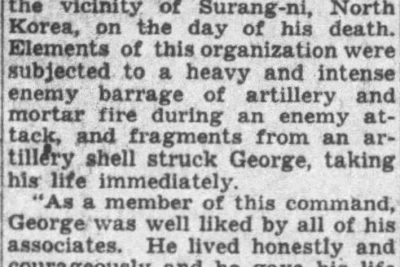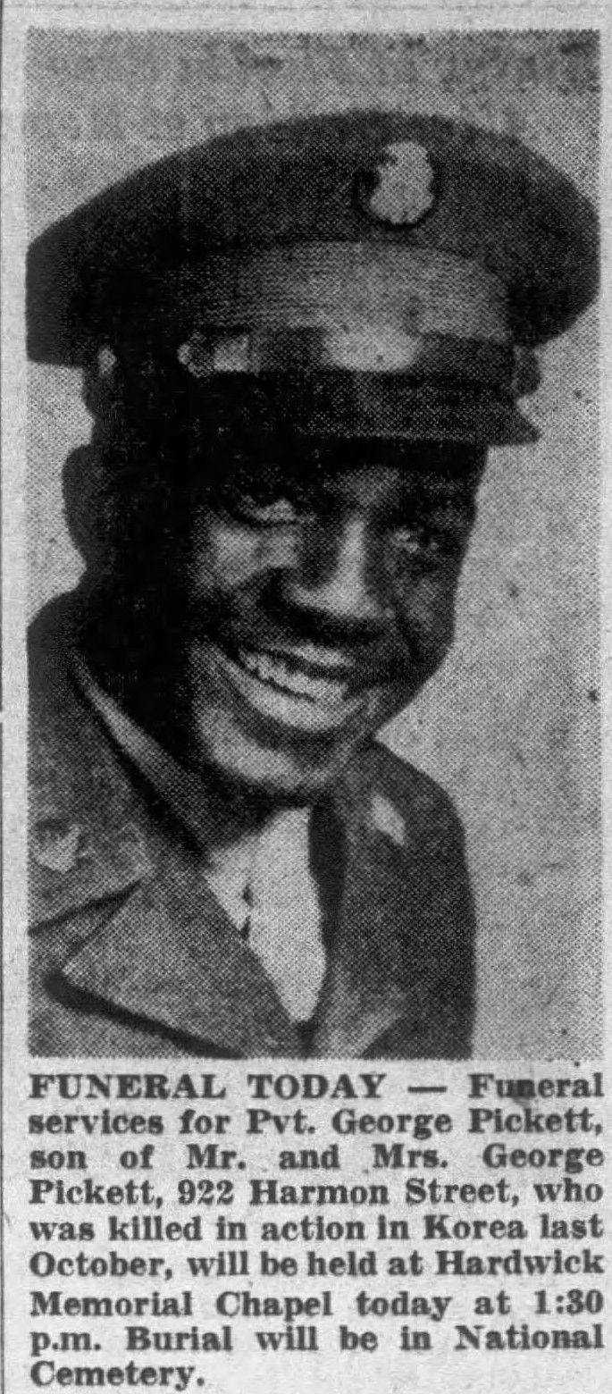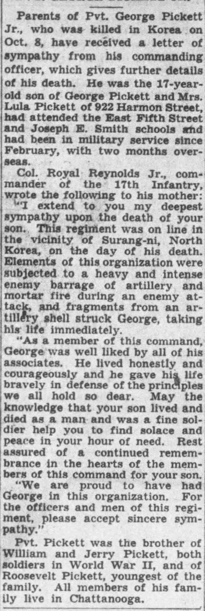 Parents of Pvt. George Pickett Jr., who was killed in Korea on Oct. 8, have received a letter of sympathy from his commanding officer, which gives further details of his death. He was the 17-year-old son of George Pickett and Mrs. Lula Pickett of 922 Harmon Street, had attended the East Fifth Street and Joseph E. Smith schools and had been in military service since February, with two months overseas. Col. Royal Reynolds Jr., commander of the 17th Infantry wrote the following to his mother: “I extend to you my deepest sympathy upon the death of your son. This regiment was on line in the vicinity of Surang-ni, North Korea, on the day of his death. Elements of this organization were subjected to a heavy and intense enemy barrage of artillery and mortar fire during an enemy attack, and fragments from an artillery shell struck George, taking his life immediately. As a member of this command, George was well liked by all of his associates. He lives honestly and courageously and he gave his life bravely in defense of the principles we all hold so dear. May the knowledge that your son lived and died as a man and was a fine soldier help you to find solace and peace in your hour of need. Rest assured of a continued remembrance in the hearts of the members of this command for your son. We are proud to have had George in this organization. For the officers and men of this regiment, please accept sincere sympathy.”