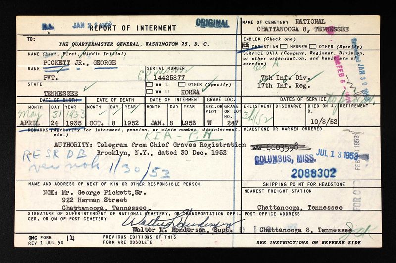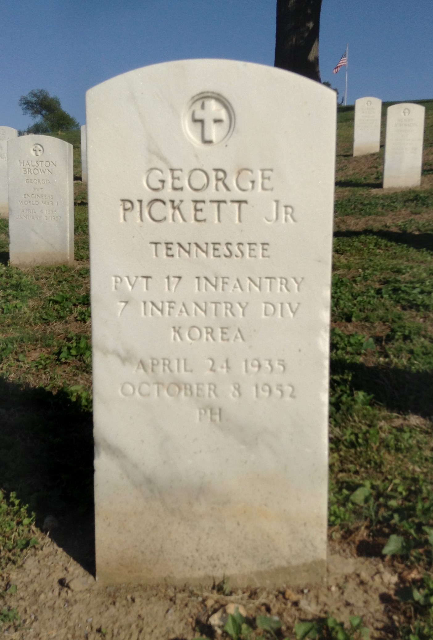 Private Pickett was member of the 17th Infantry Regiment, 7th Infantry Division. He was killed in action in North Korea on October 8, 1952. He is buried at the Chattanooga National Cemetery, W, 247.