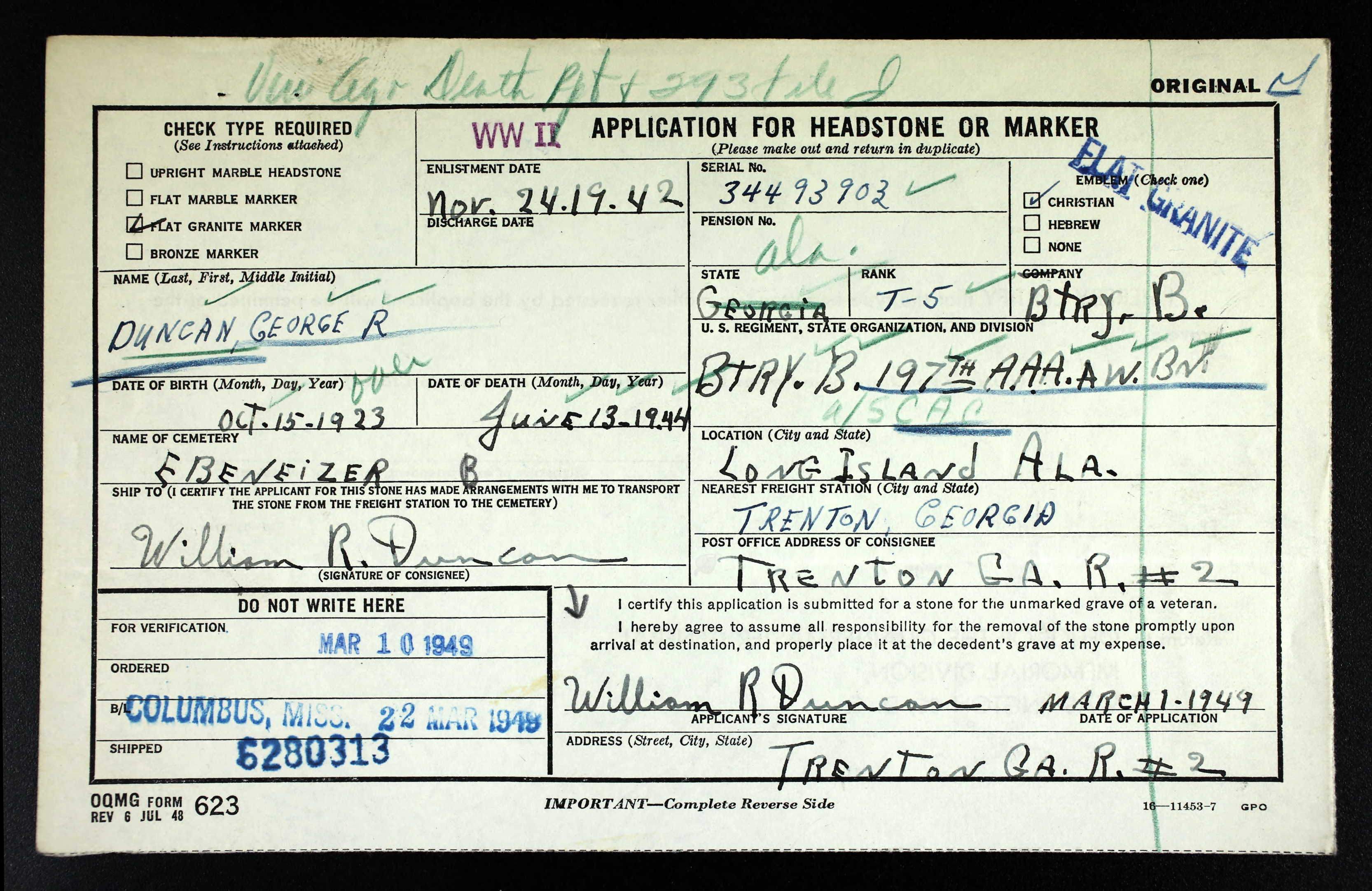 T-5 Duncan is buried at Ebenezer Cemetery at Long Island, Alabama.