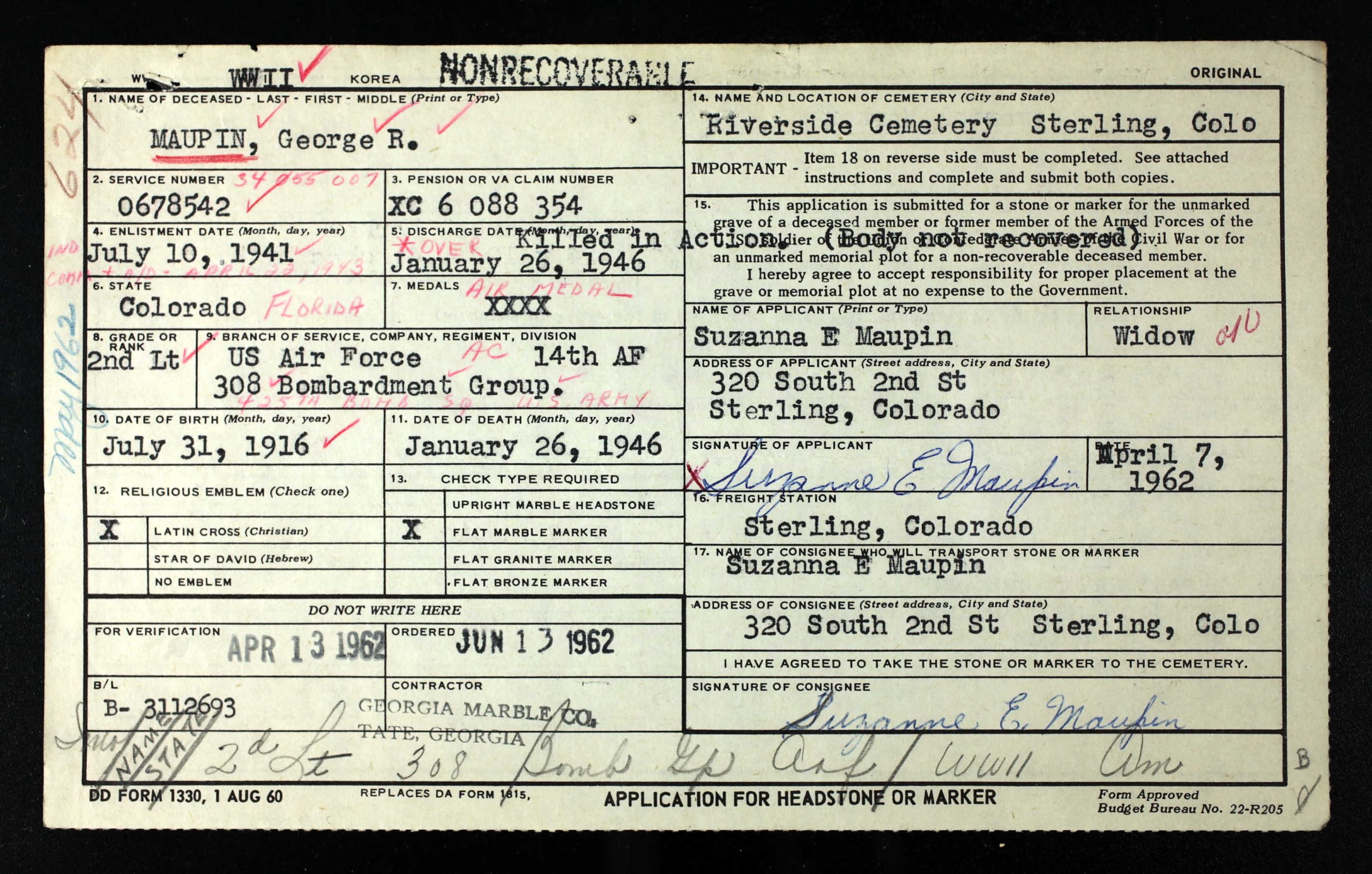 For the second time within the last six weeks, Lt. George Roy Maupin, of the Army Air Forces, has been reported missing by the War Department, the youth’s fahter, Guy Maupin, of the Lexington police department, said today. The police official said he had been informed by the War Department that Lieutenant Maupin, a bombardier-pilot, had been missing since Jan. 25 while on a mission in the China-India area. No other details were given.