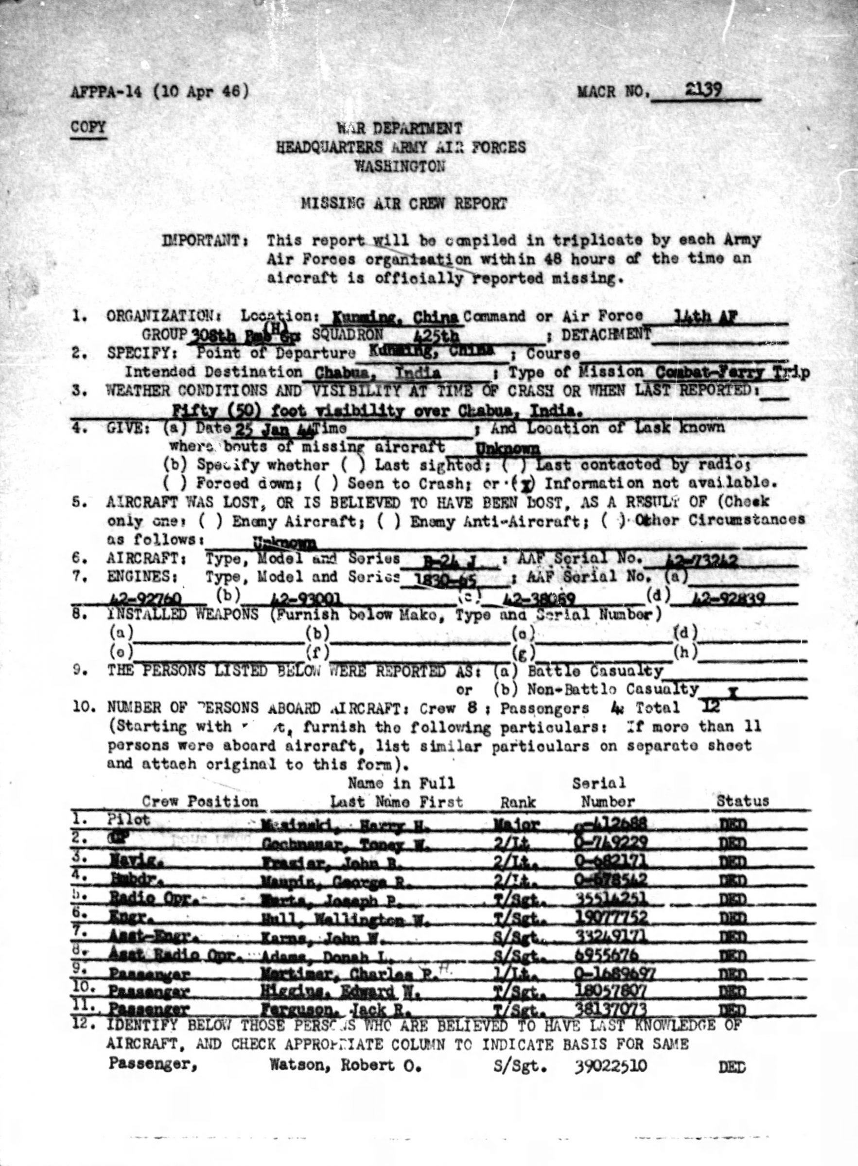Aircraft B-24J with serial number 42-73242 departed from Kunning, China on a combat-ferry trip to Chabus, India.