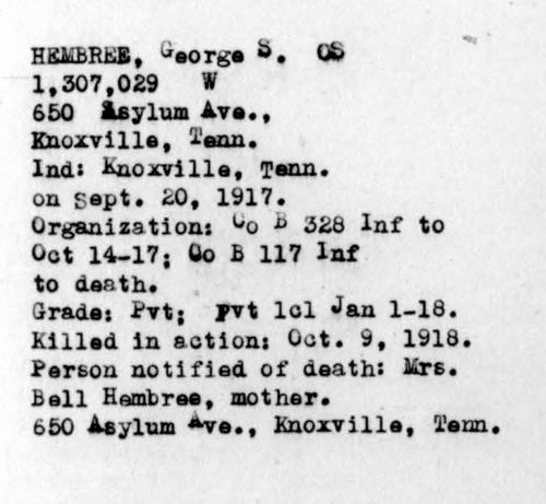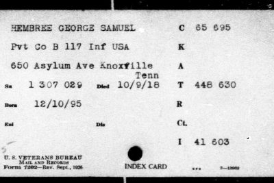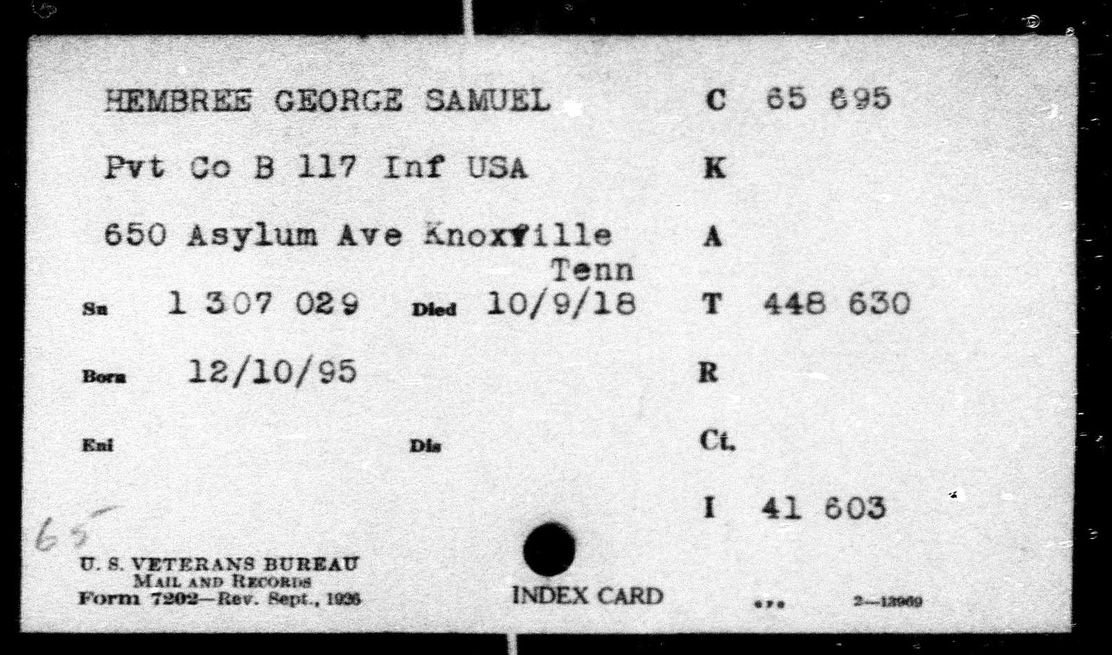 George Samuel Hembree was born December 10, 1895 in Middlesboro, Kentucky. He lived at 650 Asylum Avenue in Knoxville and was a News Agent for Cresent News Company of New Orleans, Louisanna.