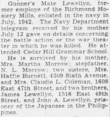 Gunner’s mate Lewellyn, former employe of the Richmond Hosiery Mills, enlisted in the navy in July, 1942. The Navy Department telegram received by his mother July 12 gave no details concerning the battle action or the war theater in which he was killed. He attended Cedal Hill Grammar School. He is survived by his mother, Mrs. Martha Morrow; stepfather, N.L. Morrow; two sisters, Mrs. Haffie Burnett, 4309 Sixth Avenue, and Mrs. Claudie L. Coleman, 1608 East 47th Street, and two brothers, James Lewellyn, 1516 East 49th Street and John A. Lewellyn, prisoner of the Japanese in the Philippines.
