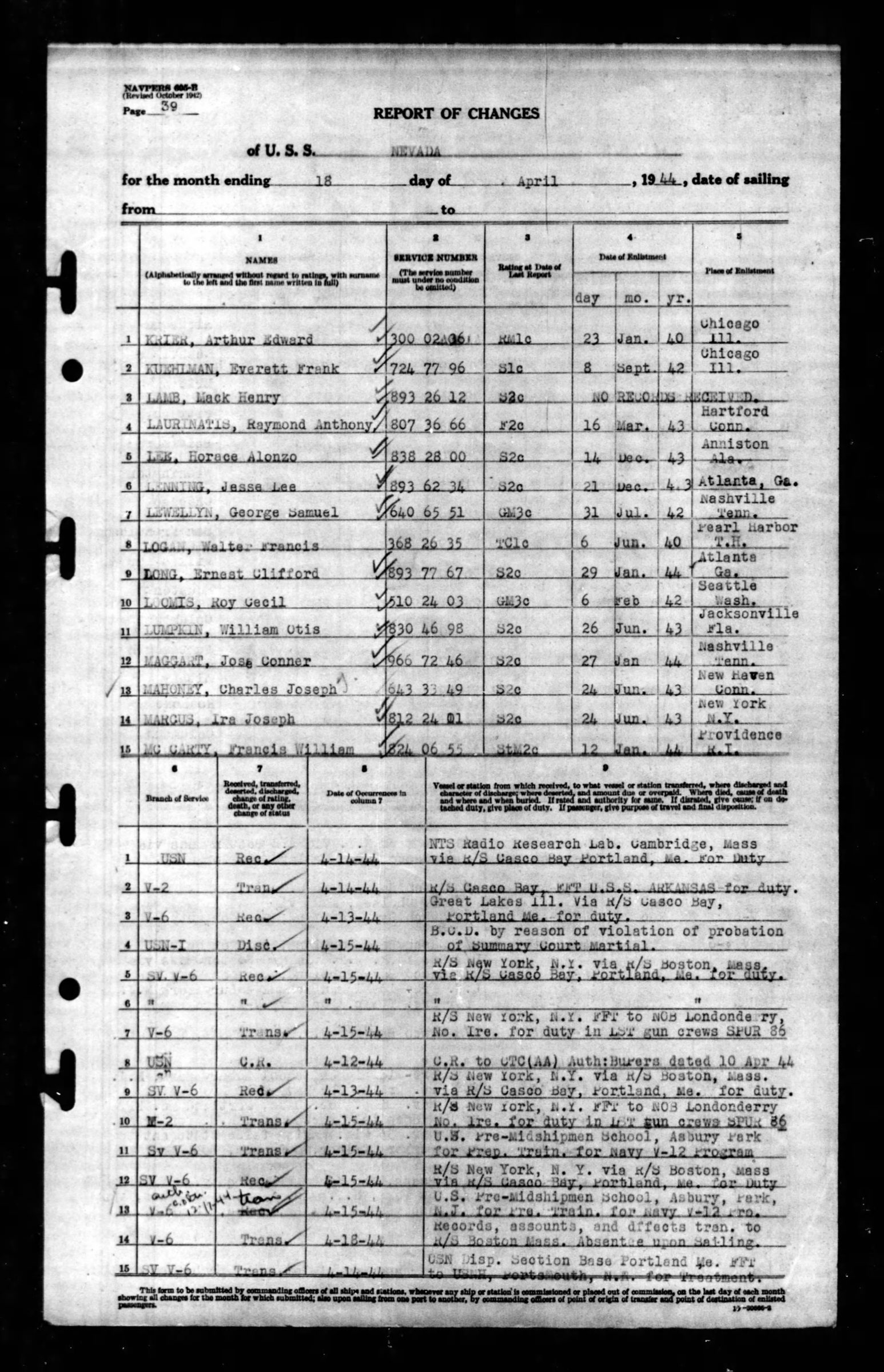 George Samuel Lewellyn, gunner’s mate third class, USNR, son of Mrs. Martha Elizabeth Morrow, 1516 East 49th Street, was listed as killed in line of duty. Llewellyn has been stationed in England and took part in the invasion.