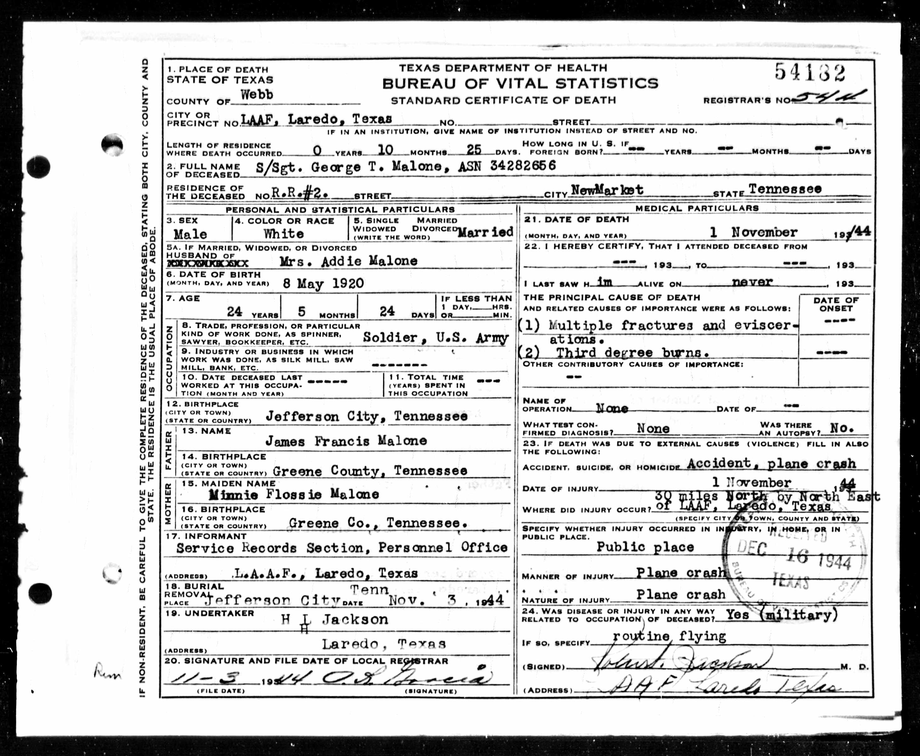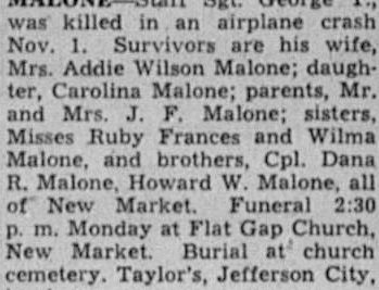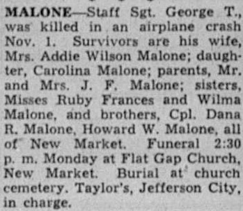 Staff Sgt. George T. Malone was killed in an airplane crash Nov. 1. Survivors are his wife, Mrs. Addie Wilson Malone; daughter, Carolina Malone; parents, Mr. and Mrs. J.F. Malone; sisters, Misses Ruby Frances and Wilma Malone, and brothers, Cpl. Dana R. Malone, Howard W. Malone, all of New Market. Funeral at Flat Gap Church, New Market. Burial at church cemetery.