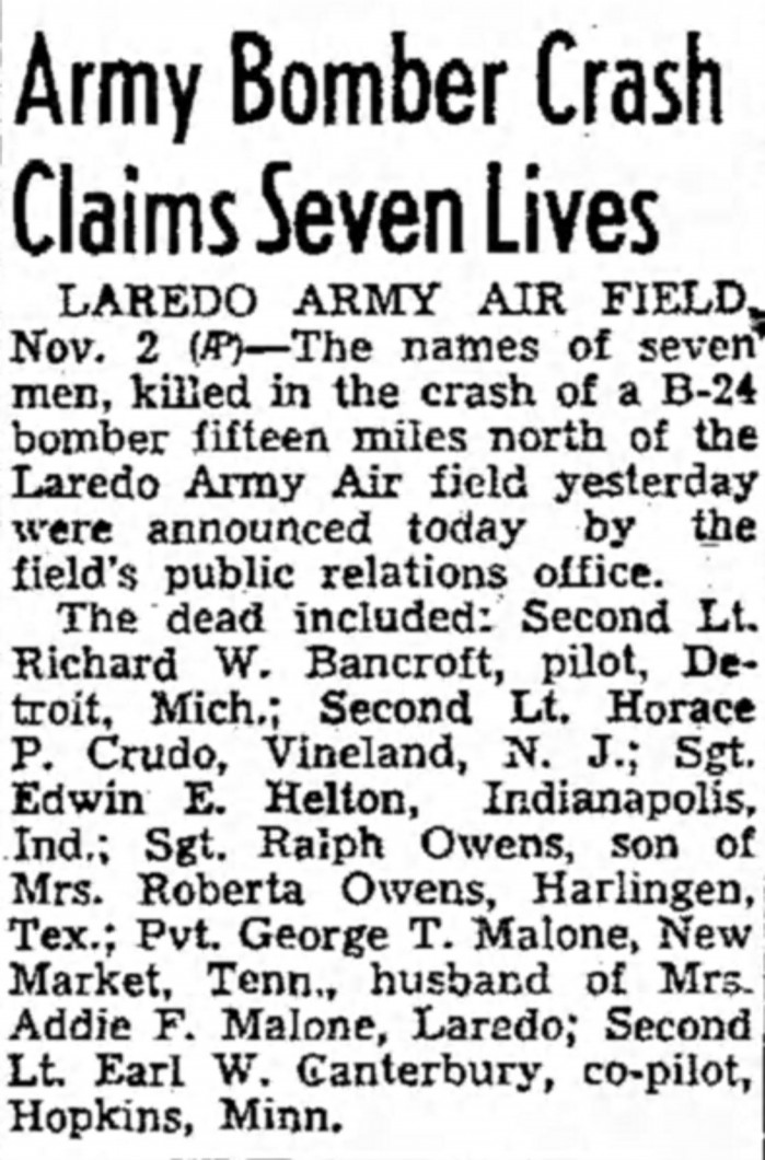Army Bomber Crash Claims Seven Lives. Laredo Army Airfield, Texas, Nov. 2 – The names of seven men killed in the crash of a B-24 bomber, 15 miles north of the Laredo Army Airfield were announced by the field’s public relations office.