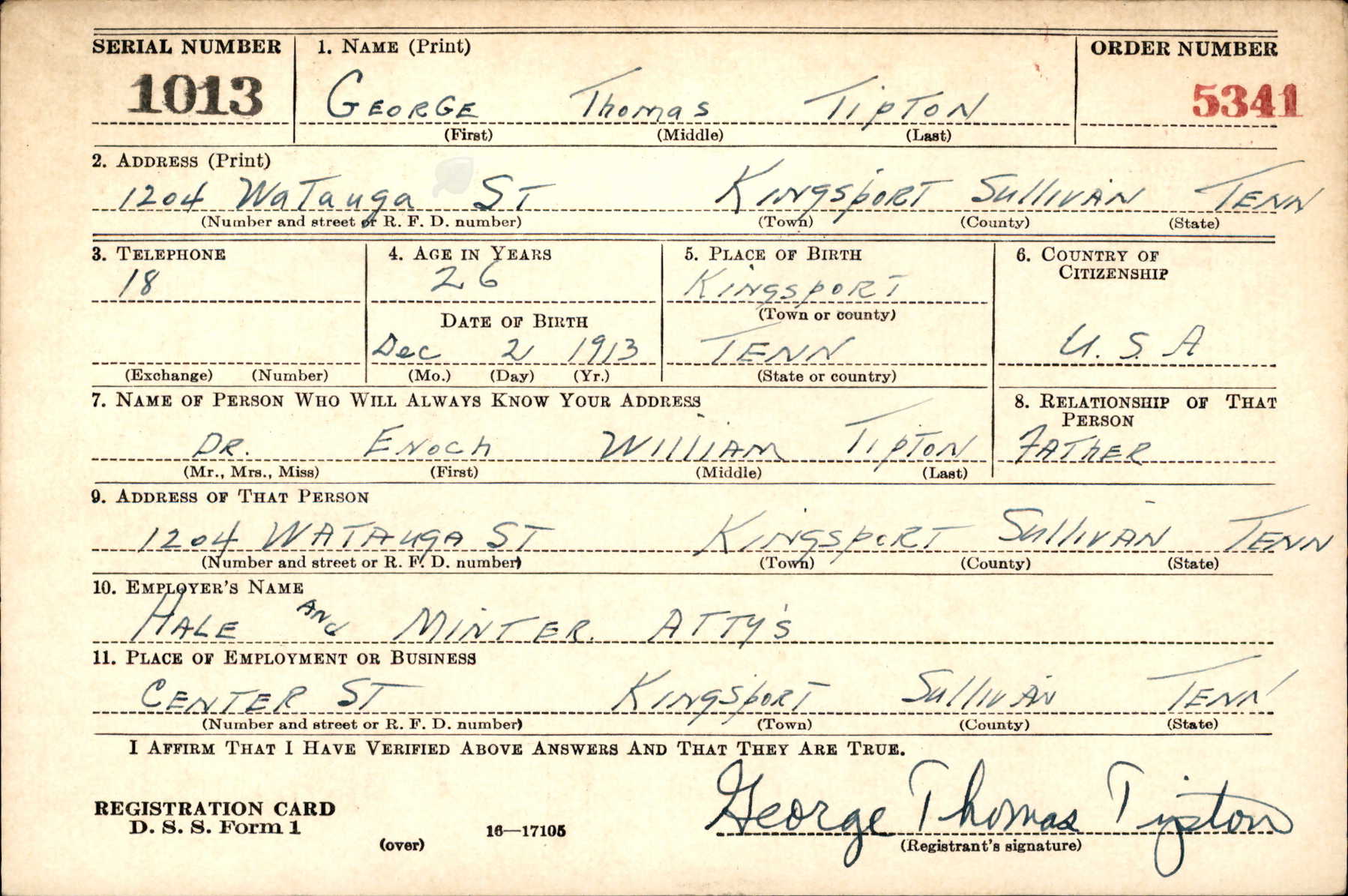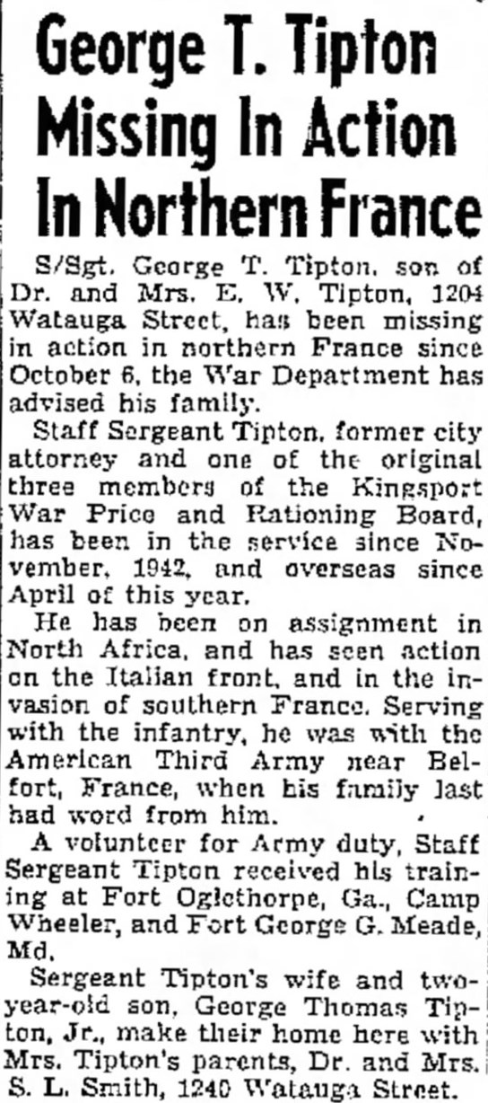 George Thomas Tipton born 2 December 1913, died 6 October 1944. He was killed in action in eastern France near the town of Fremi Fontaine.