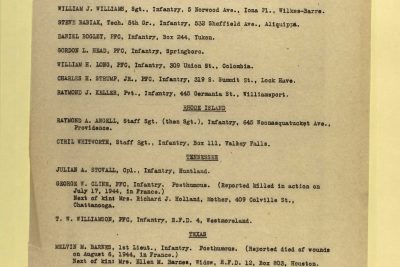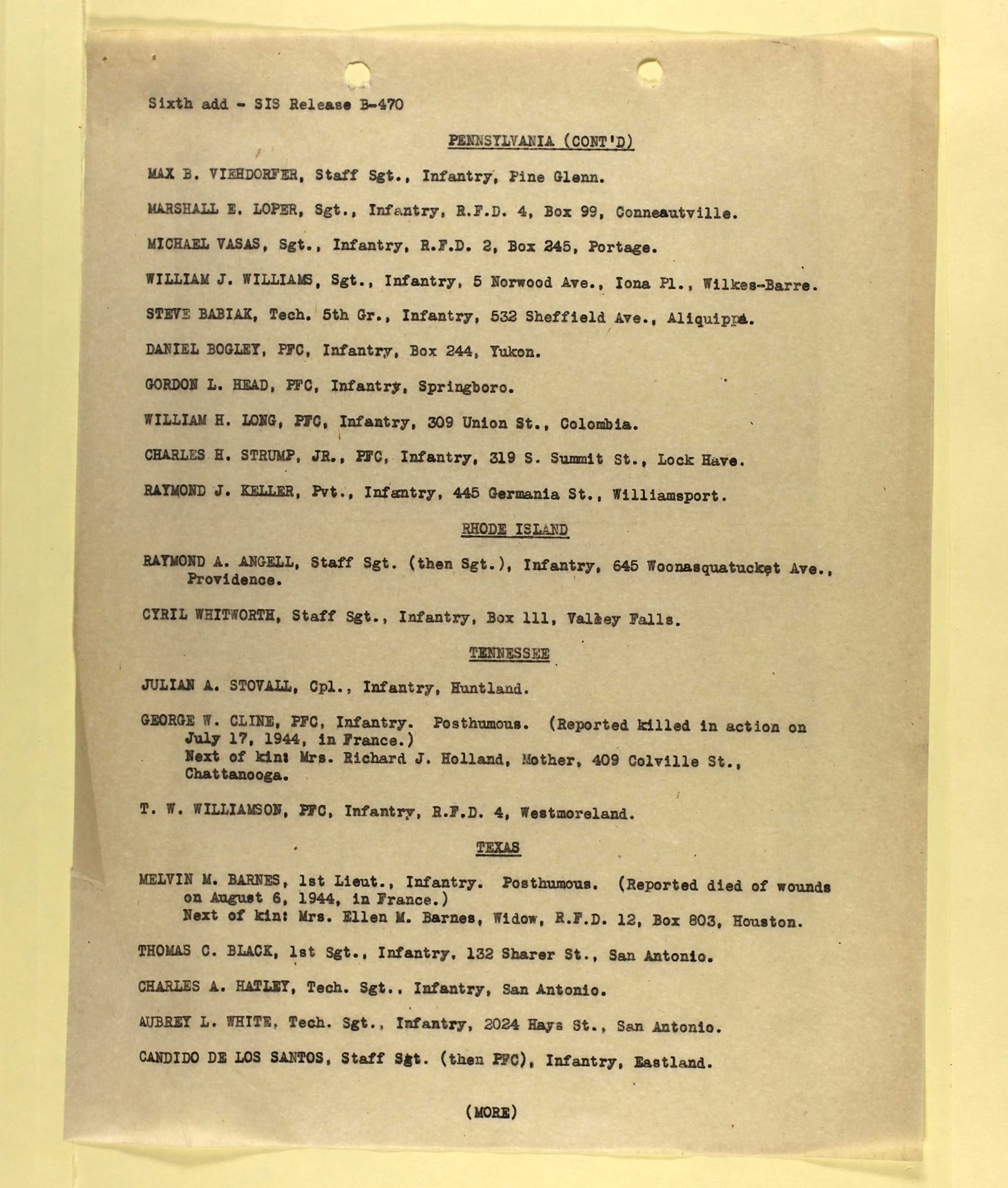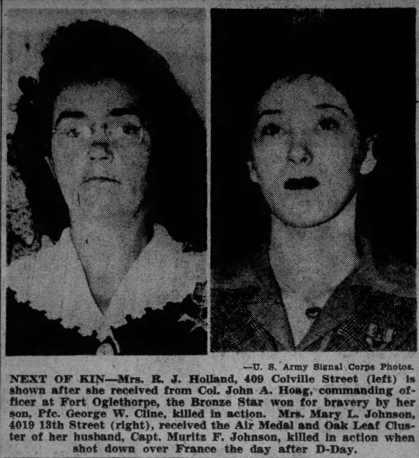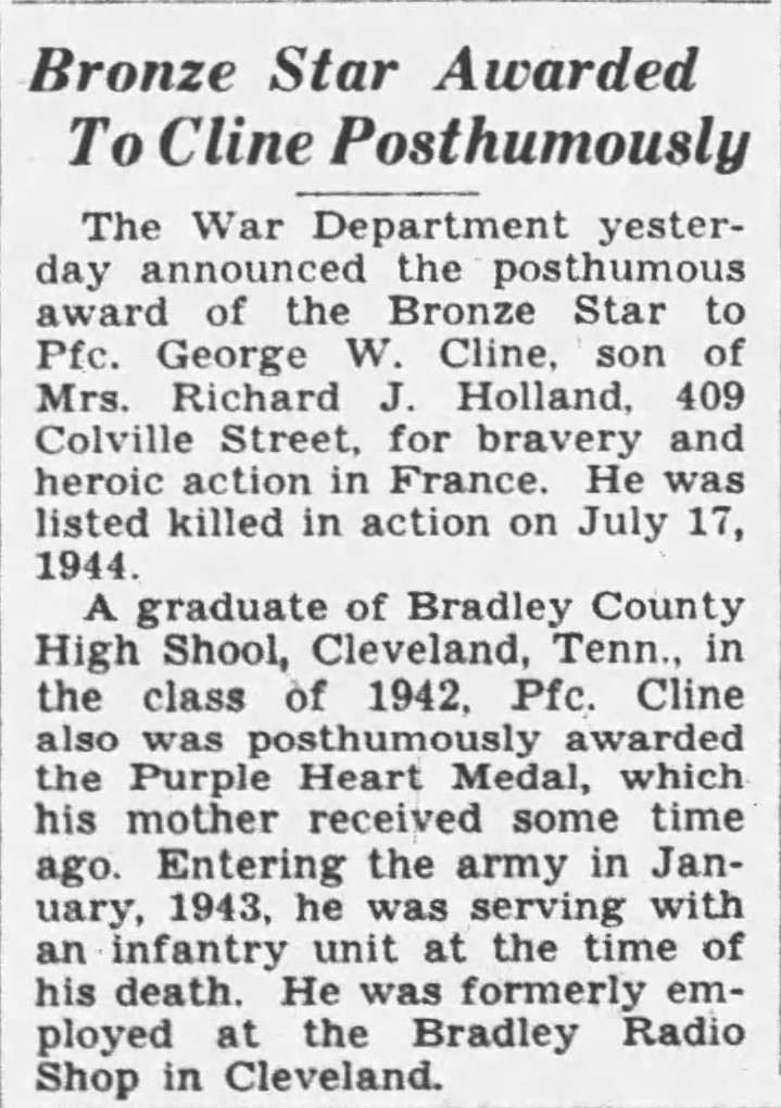 The War Department yesterday announced the posthumous award of the Bronze Star to Pfc. George W. Cline, son of Mrs. Richard J. Holland, 409 Colville Street, for bravery and heroic action in France. He was listed killed in action on July 17, 1944.
