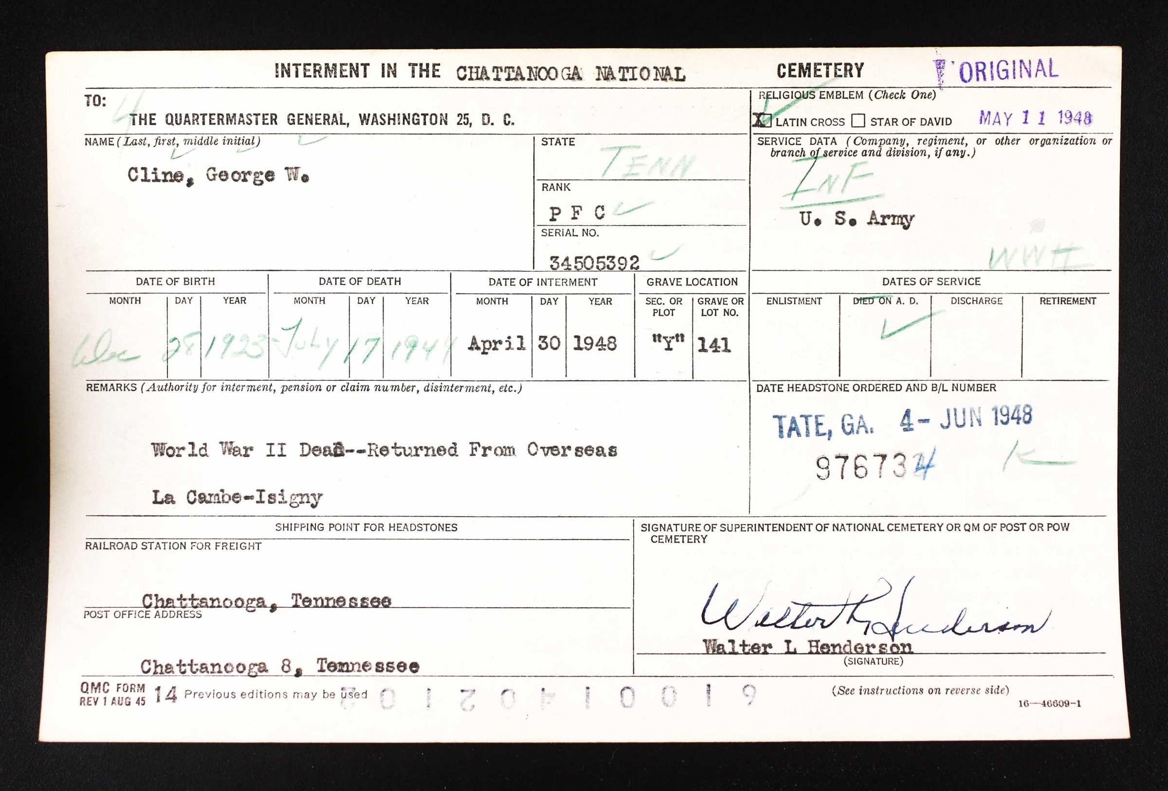 Died 17 July 1944 in France. PFC Cline was initially buried at La Cambe-Isigny, France