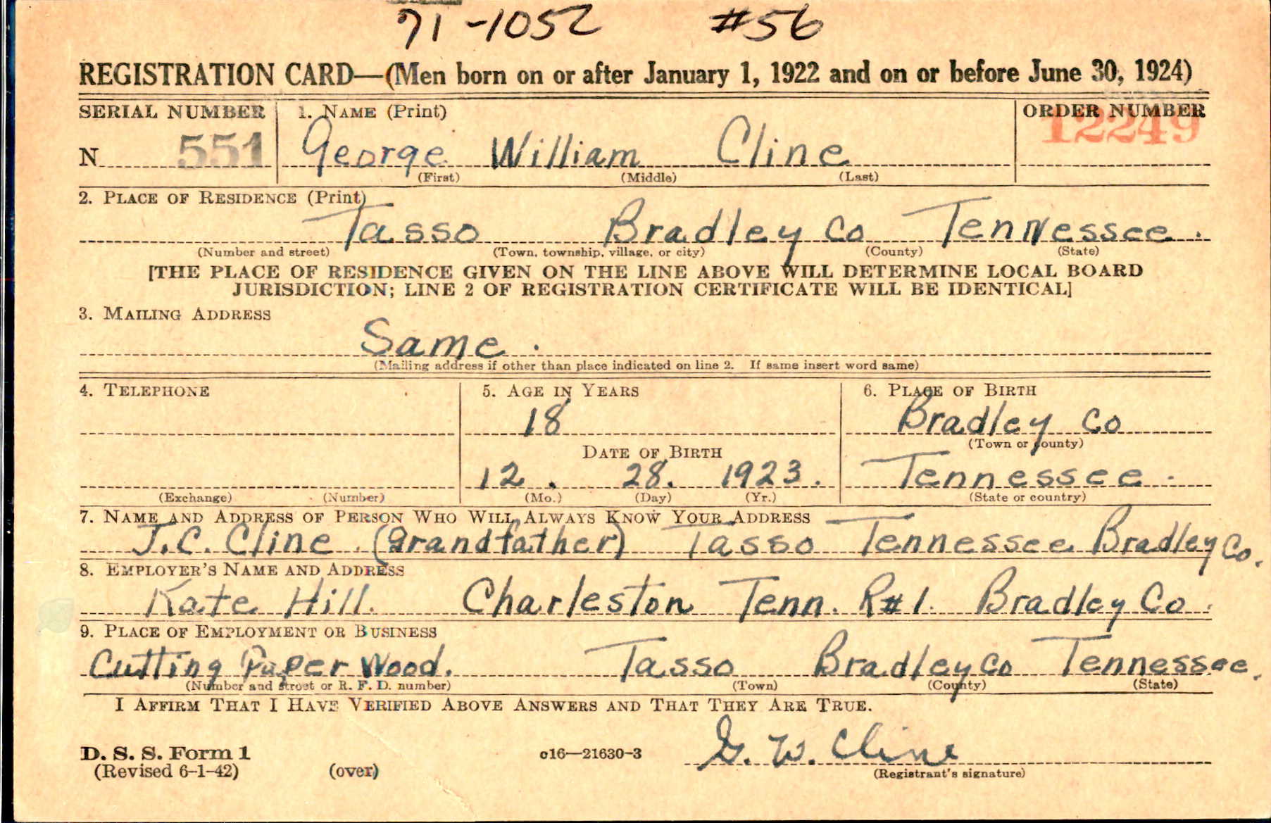 George W. Cline was born in Bradley County, Tennessee on 28 December 1923, son of Mary Lee Cline and stepson of Richard Jenning Holland and stepbrother of Richard Jenning Holland Jr. and stepsister Mary Louise Holland.