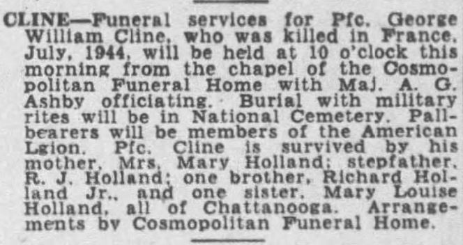 A graduate of Bradley County High School, Cleveland, Tenn., in the class of 1942, Pfc. Cline also was posthumously awarded the Purple Heart Medal, which his mother received some time ago. Entering the army in January, 1943, he was serving with an infantry unit at the time of his death. He was formerly employed at the Bradley Radio Shop in Cleveland.