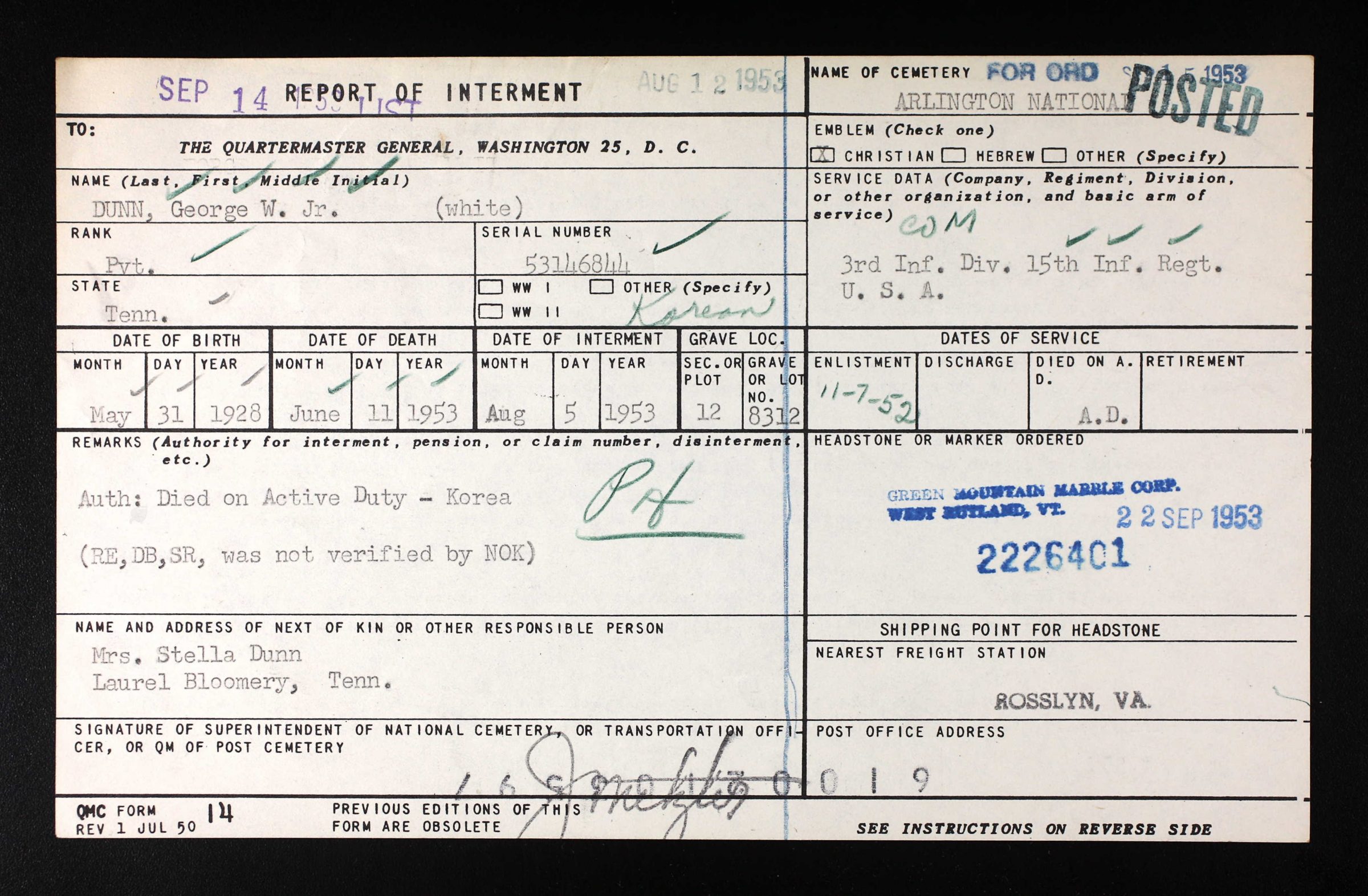 Private Dunn was a member of the 15th Infantry Regiment, 3rd Infantry Division. He was killed in action while fighting the enemy in North Korea on June 11, 1953.