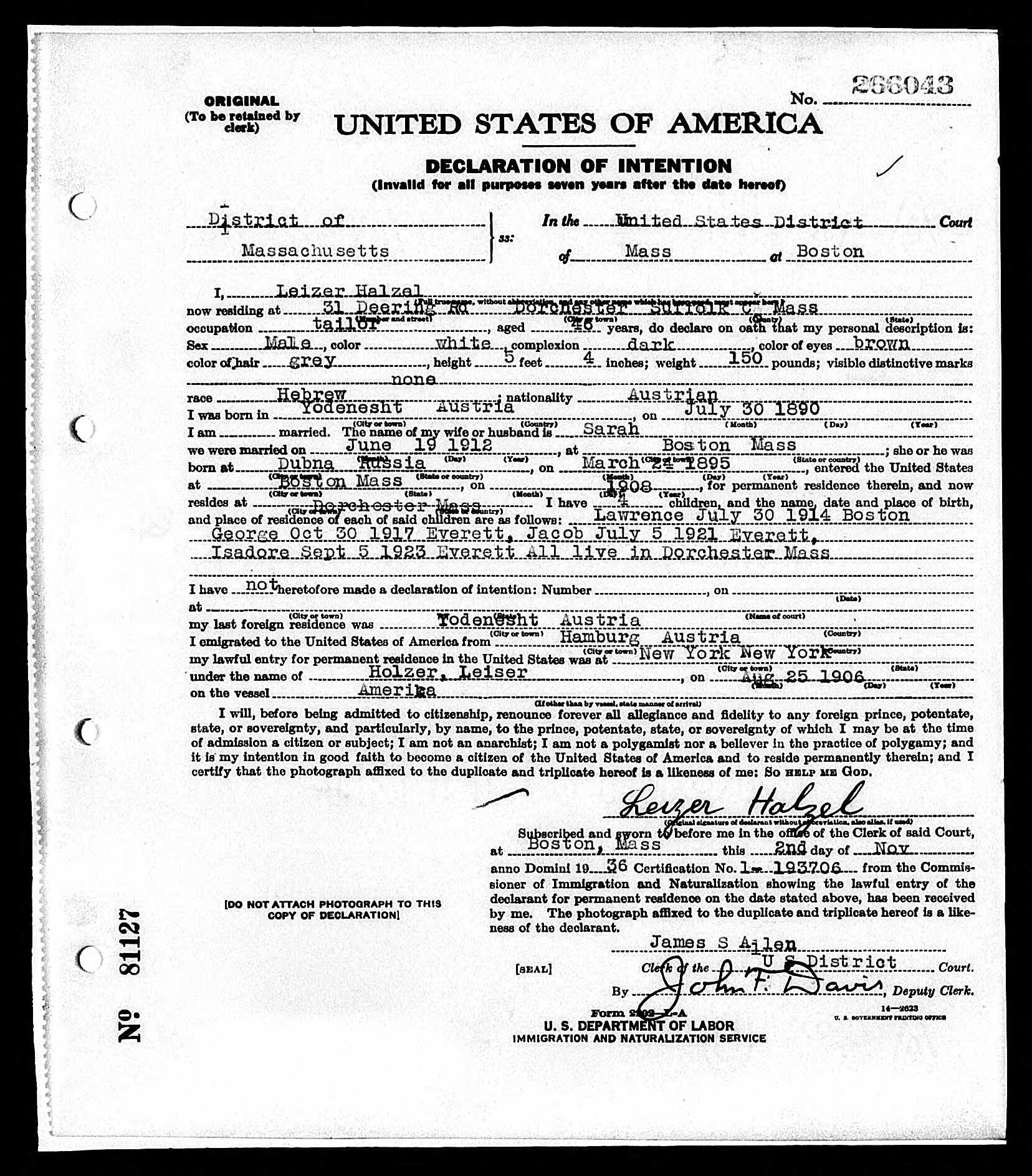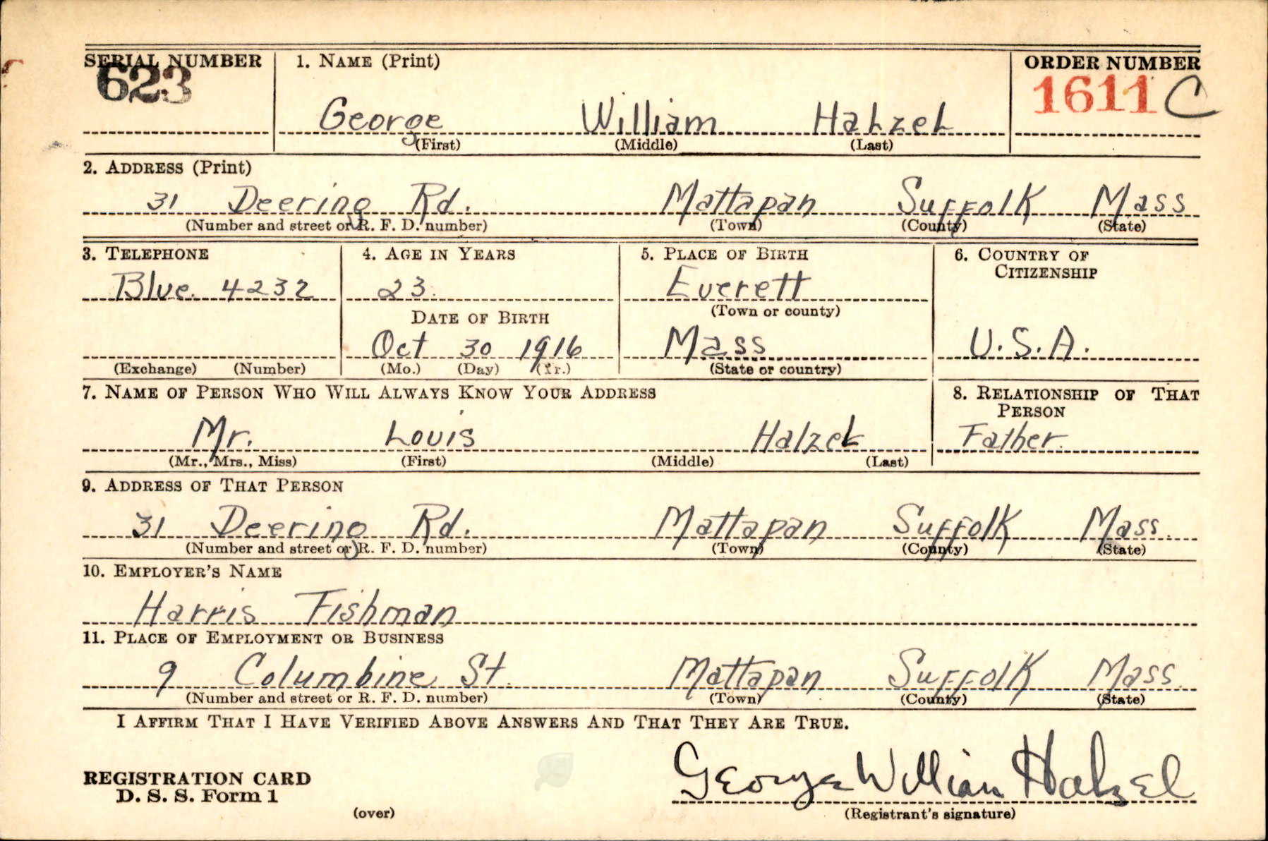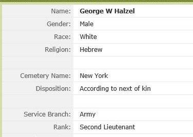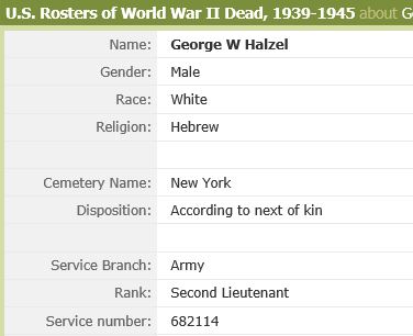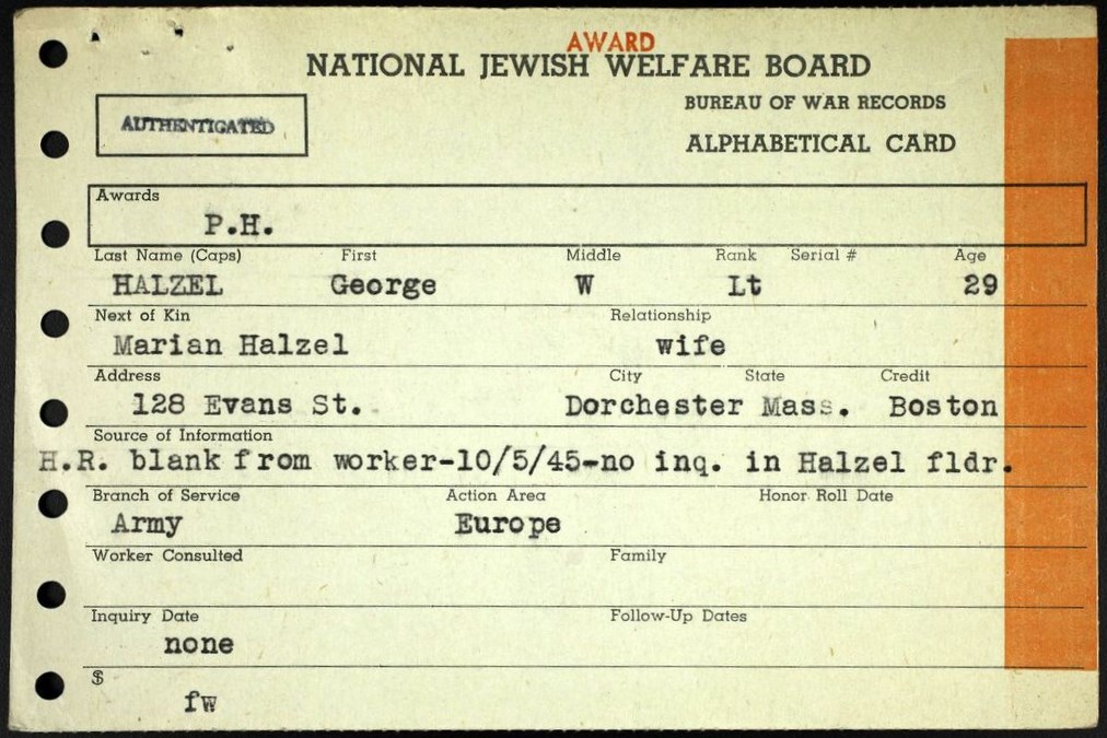 Second Lieutenant George W. Halzel was born in Everett, Massachusetts, the son of Louis Halzel and Sarah Bass. His father was an immigrant from Austria and his mother from Dubna, Russia. He had an older brother, Lawrence and a younger brother Jacob and sister Isadore. He was married with Marion Pearlman.
