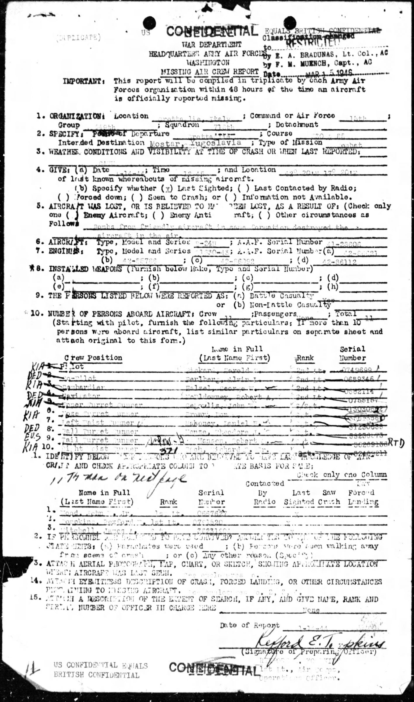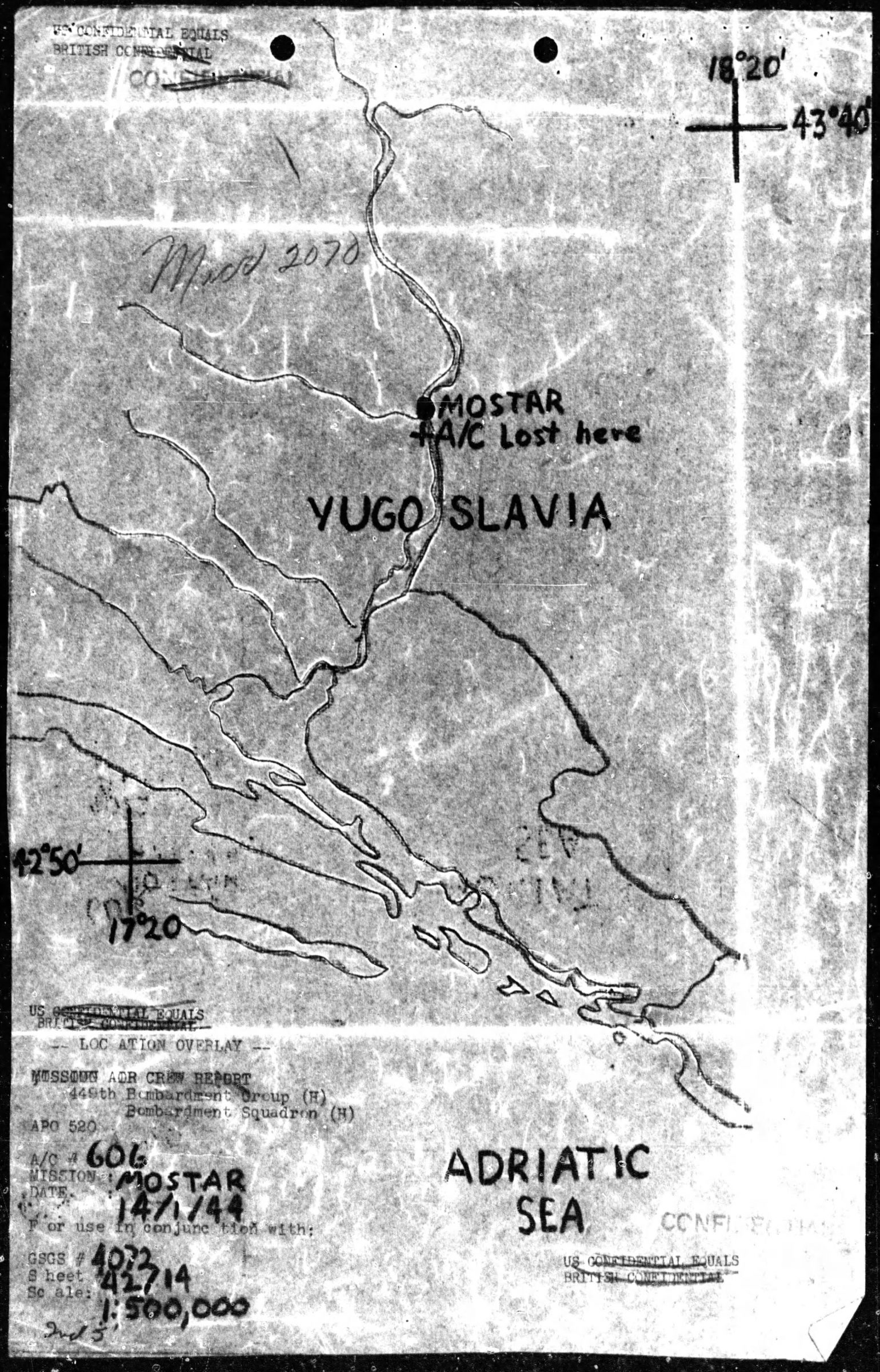 Aircraft B-24H with serial number 41-28606 departed from Grotta, Italy on a combat mission to Mostar, Yugoslavia. Bombs from a friendly aircraft in the same formation destroyed the aircraft in the air over Mostar in Yugoslavia.