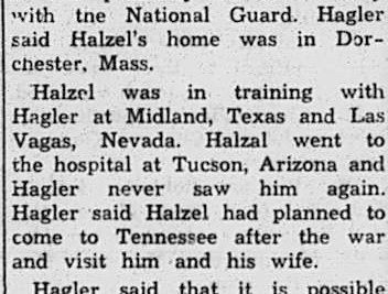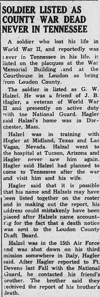 Recent research has discovered an article in the Lenoir City News, September 3, 1951 indicating that Second Lieutenant Hazel was not from East Tennessee but from Massachusetts.