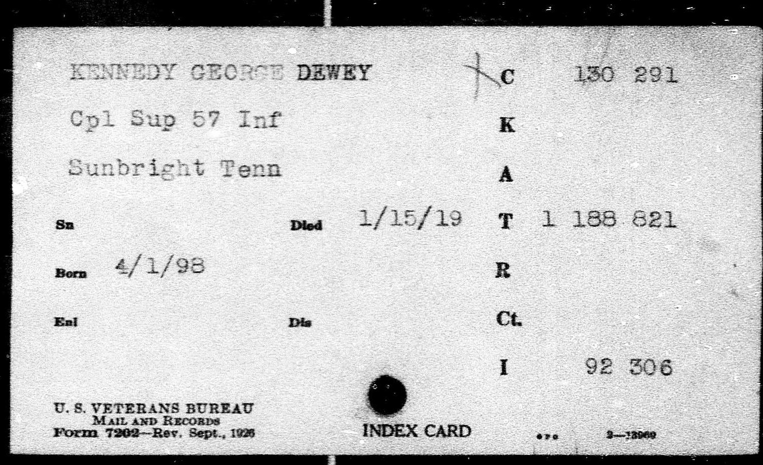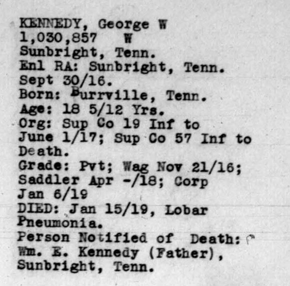 Corporal George Dewey Kennedy of Sunbright, Tennessee served in Supply, 57th Infantry. He died of pneumonia on 10 January 1919 at Camp Pike, Arkansas.