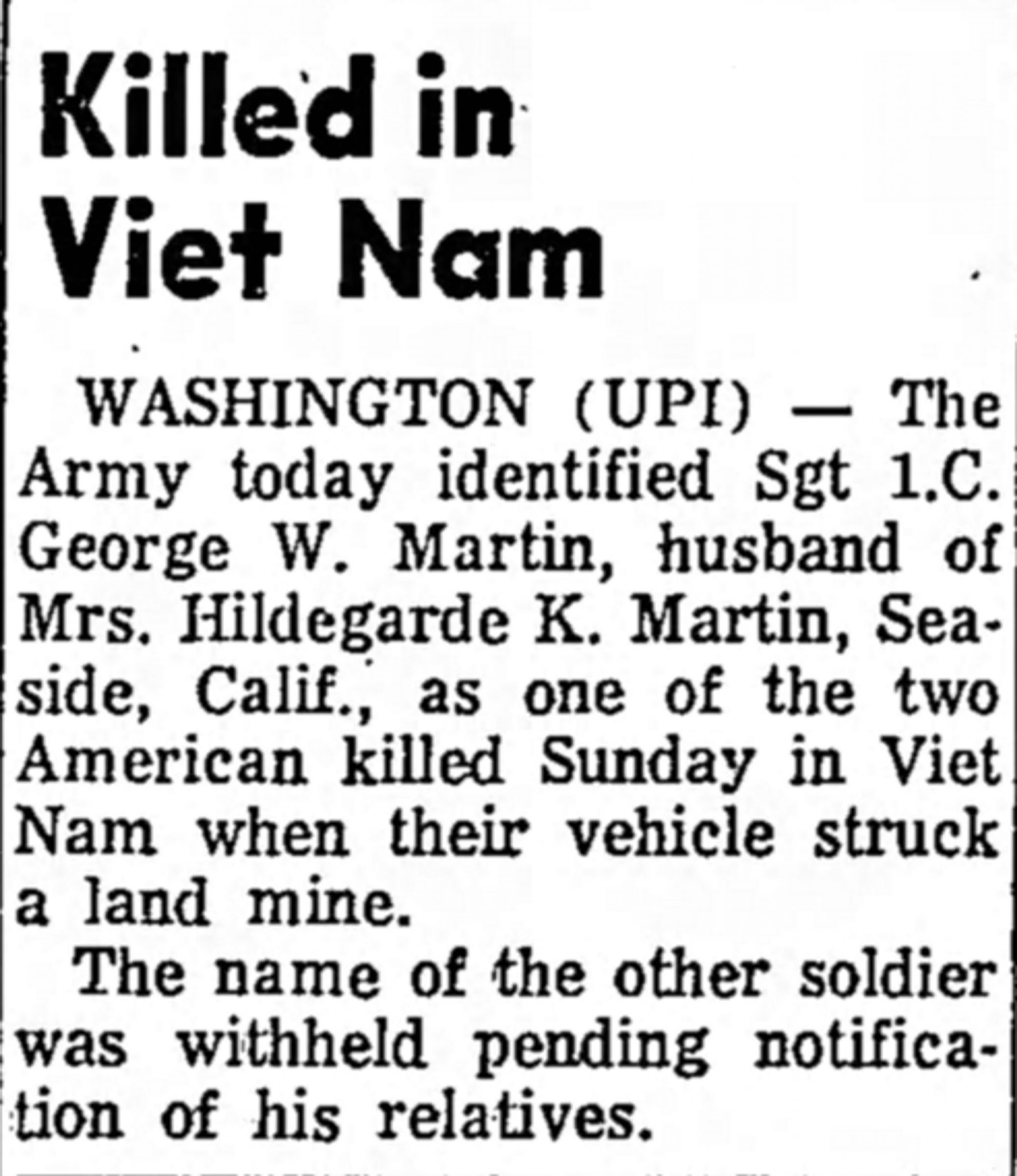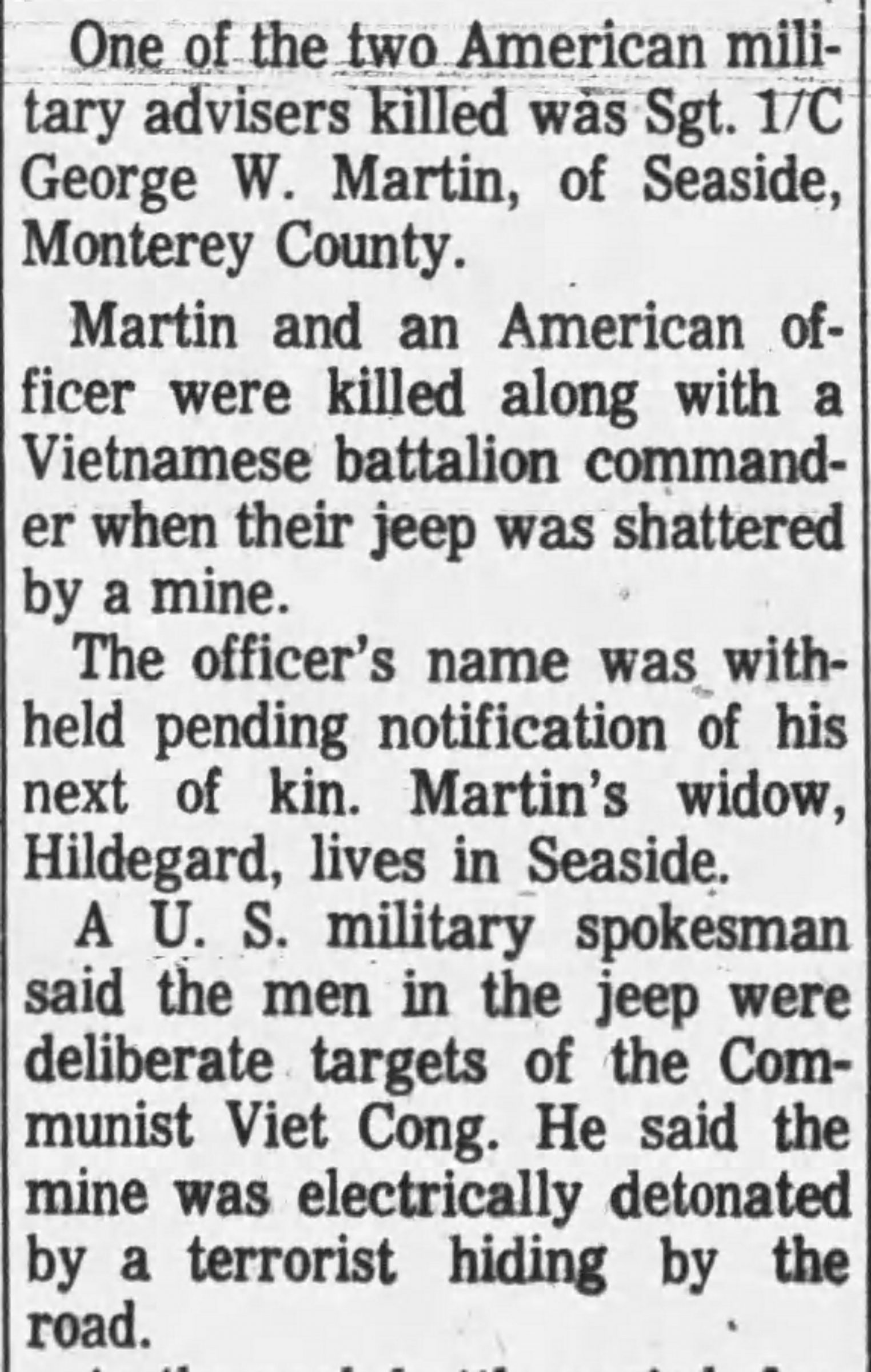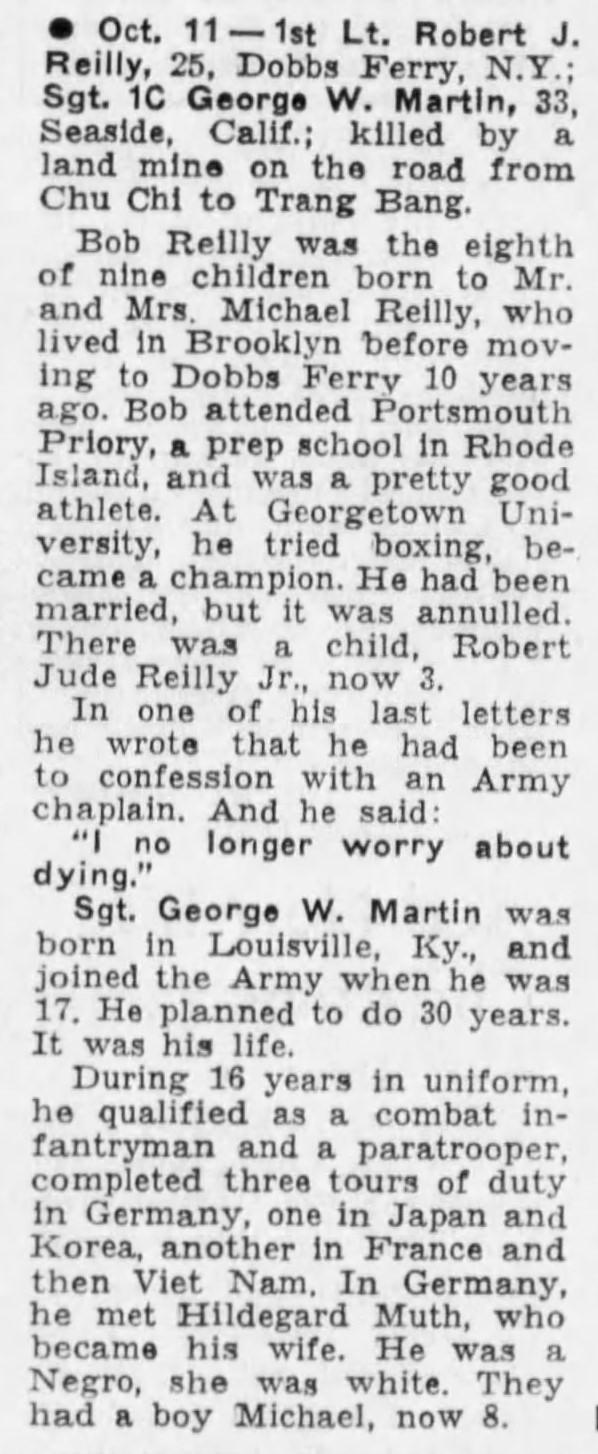 Oct. 11 – 1st Lt. Robert J. Reilly, 25 of Dibbs Ferry, N.Y.; Sgt. 1C George W. Martin, 33, Seaside, Calif.; killed by a land mine on the road from Chu Chi to Trang Bang.