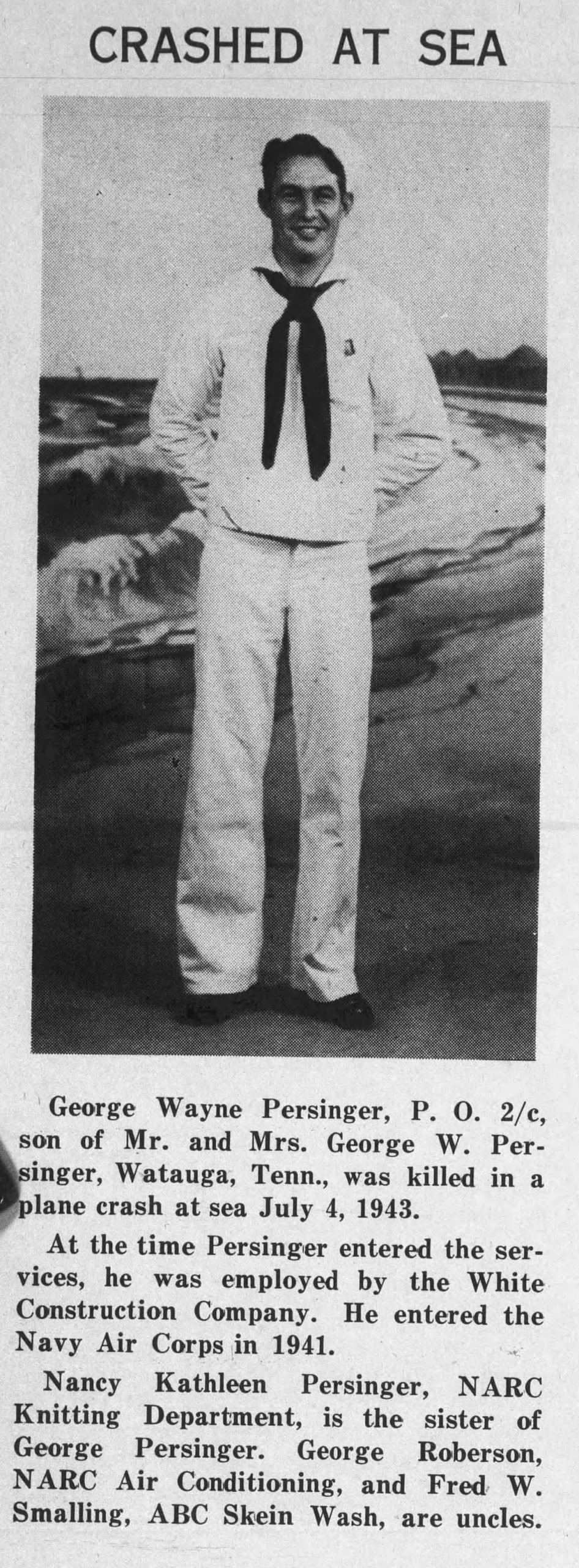 “George was a cousin to my father and was slightly older. He was an aviation enthusiast and so was my father. My father looked up to him and admired him greatly. His loss at sea affected the family and my father tremendously and in honor of George (better known as Wayne) when his first born came along, he named me after Wayne. Wayne is memorialized on a monument in New York City, with the Wayne Persinger bridge over the Watauga River at Watauga and with myself.”