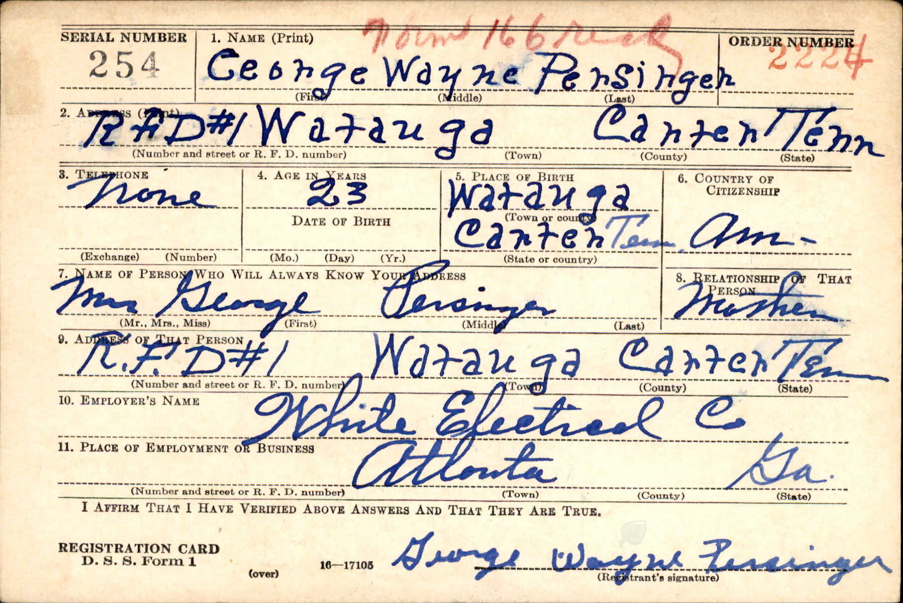 George Wayne Persinger was born at Watauga, Tennessee, the son of George William Persinger and Mary Nelle Rumbley