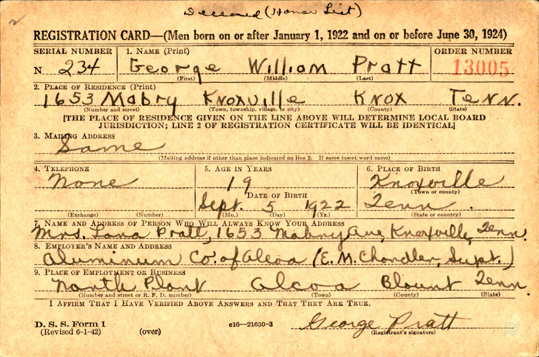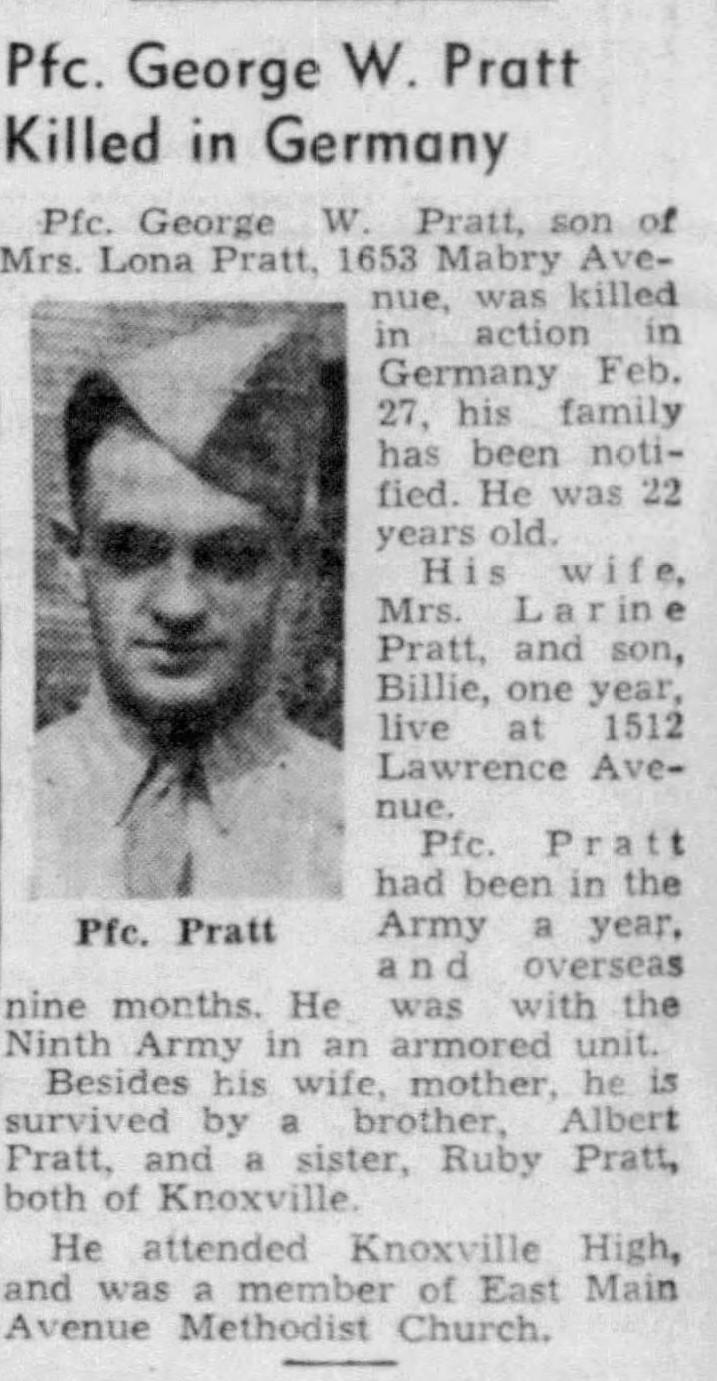 Pfc. George W. Pratt, son of Mrs. Lona Pratt, 1653 Mabry Avenue, was killed in action in Germany Feb. 27, his family has been notified. He was 22 years old. His wife, Mrs. Larine Pratt, and son, Billie, one year, live at 1512 Lawrence Avenue. Pfc. Pratt had been in the Army a year and overseas nine months. He was with the Ninth Army in an armroe3d unit. Besides his wife, mother, he is survived by a brother, Albert Pratt, and a sister, Ruby Pratt, both of Knoxville. He attended Knoxville High, and was a member of East Main Avenue Methodist Church.