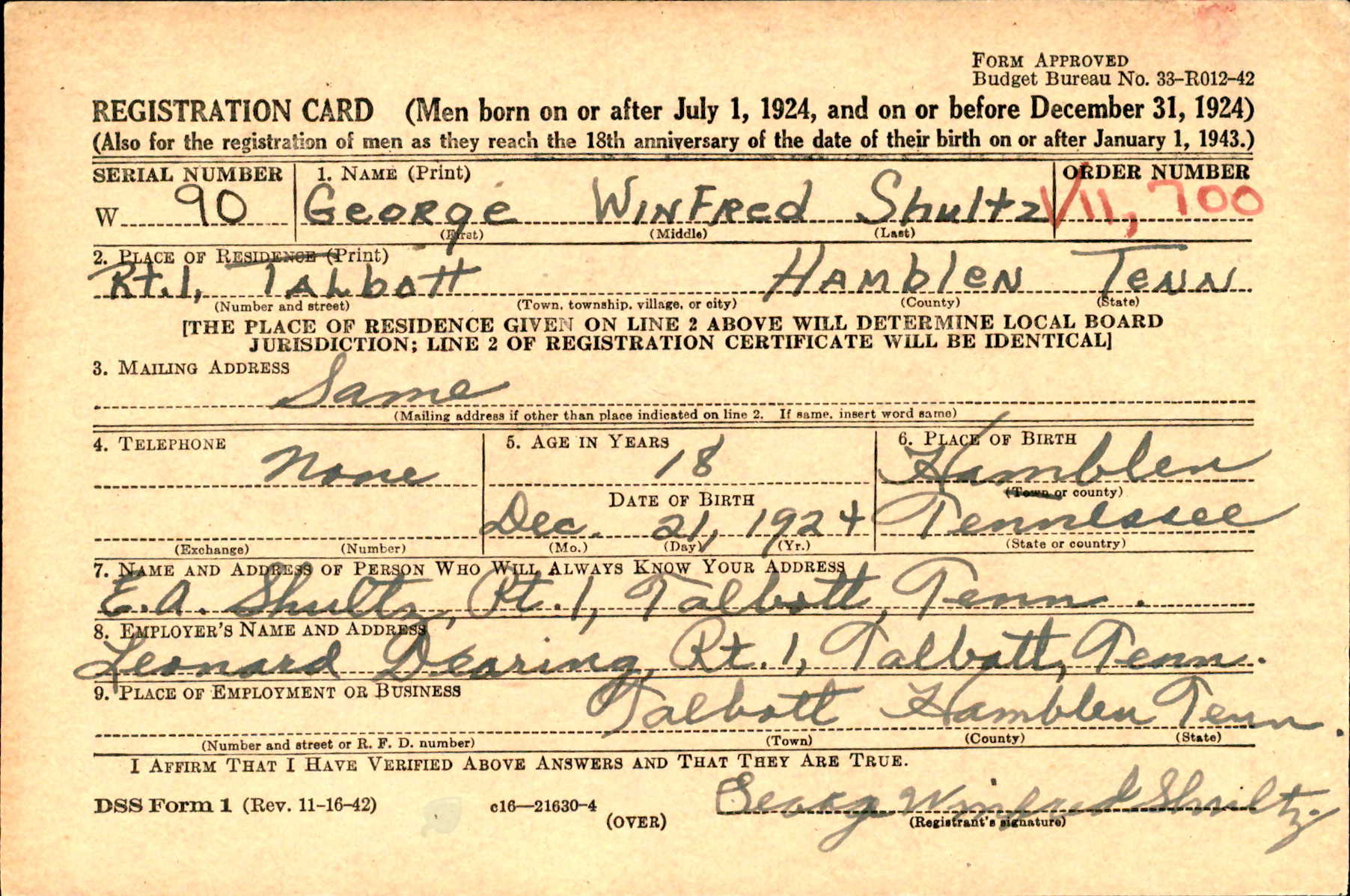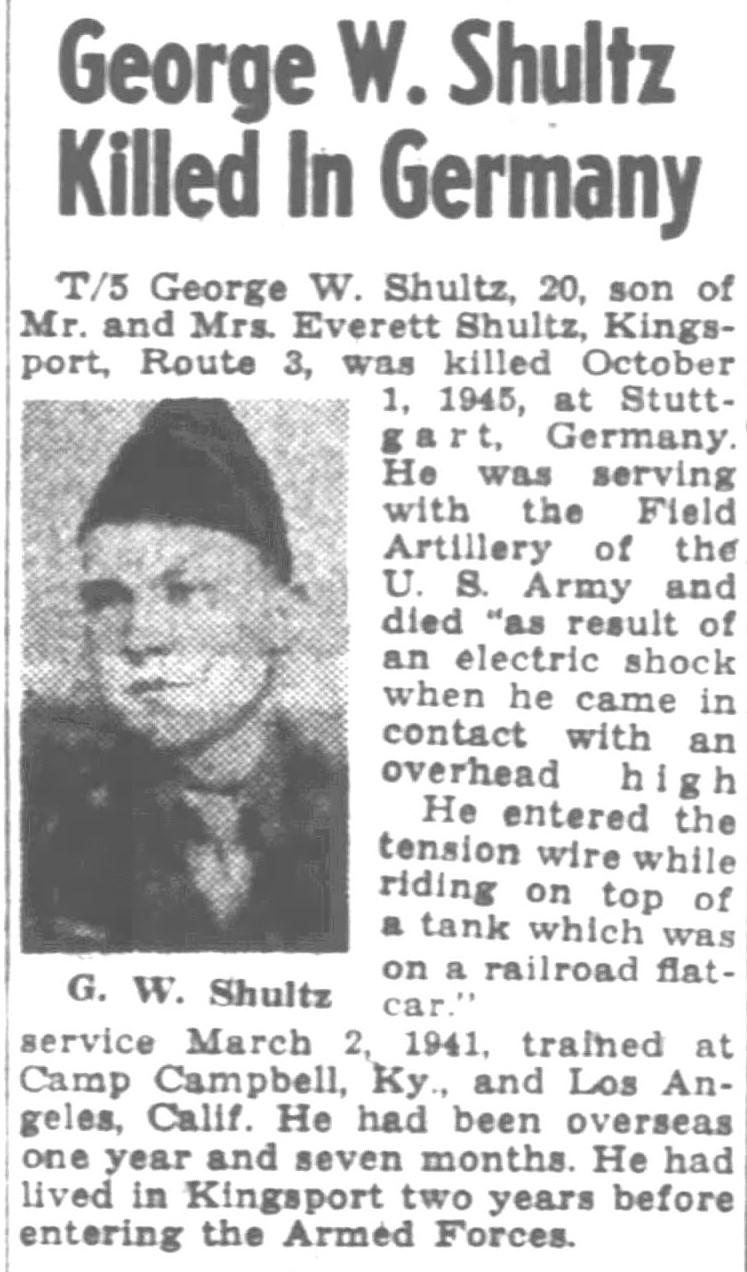 T/5 George W. Shultz, 20, son of Mr. and Mrs. Everett Shultz, Kingsport, Route 3, was killed October 1, 1945 at Stuttgart, Germany. He was serving with the Field Artillery of the U.S. Army and died as result of an electric shock when he came in contact with an overhead high tension wire while riding on top of a tank which was on a railroad flatcar. He entered the service March 2, 1941, and trained at Camp Campbell, Ky., and Los Angeles, Calif. He had been overseas one year and seven months. He had lived in Kingsport two years before entering the Armed Forces.