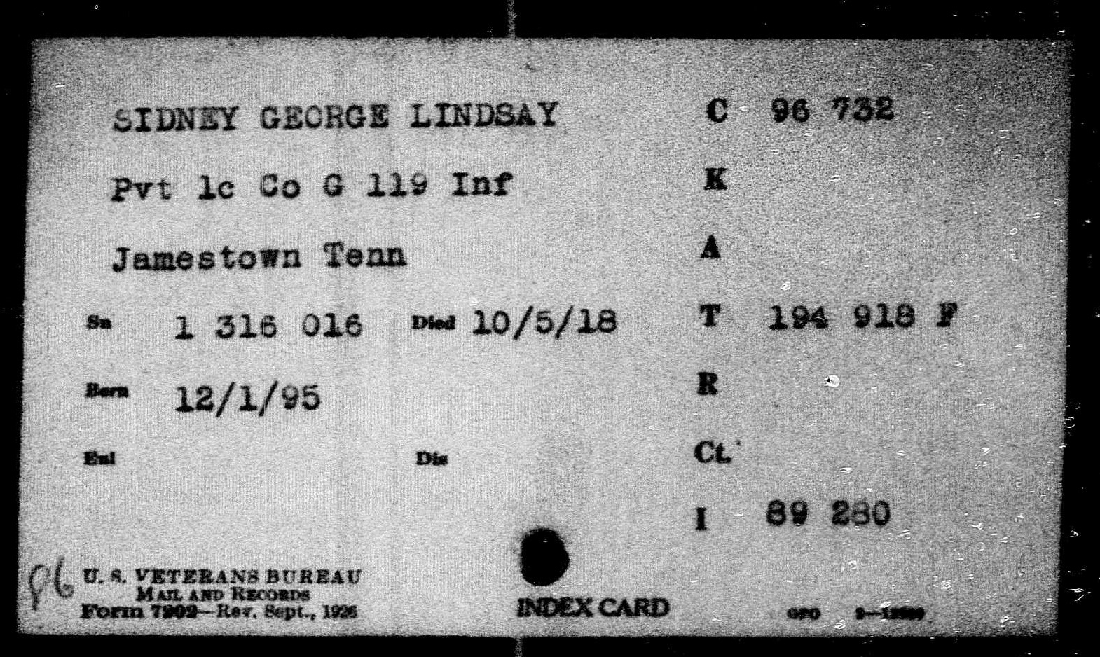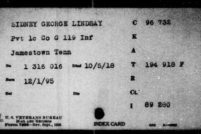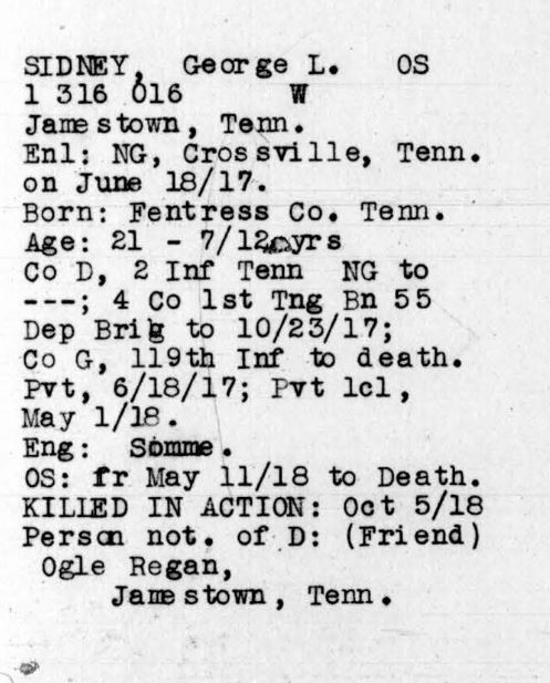 George W. Lindsey Sidner, also spelled Sidney in State records, was born in Fentress County, Tennessee and enlisted at Crossville on 18 June 1917. He was killed in action at the age of 21. He is buried plot A, row 8, grave 11, Somme American Cemetery, Bony, France.
