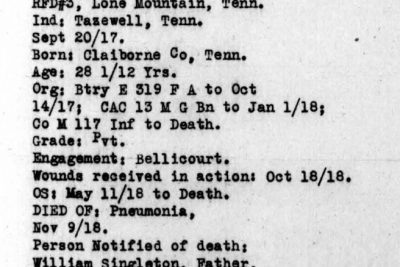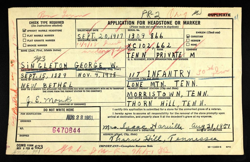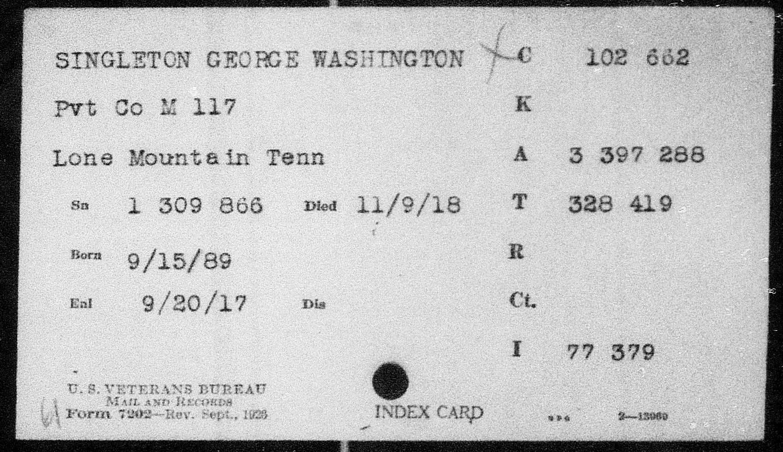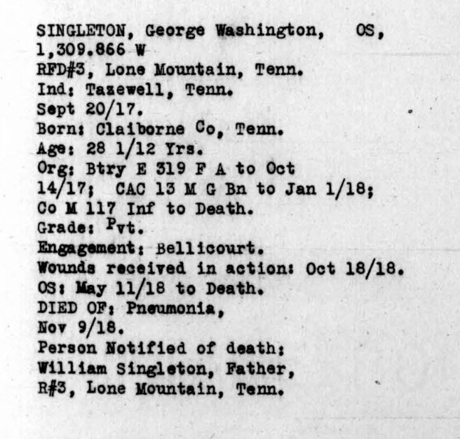 George Washington Singelton was born 15 September 1889, son of William Henry Singleton and Sarah Jane Hipsher. He was wounded on 18 October 1918 and died of pneumonia on 9 November 1918. He is buried at New Bethel Cemetery, Lone Mountain, TN.