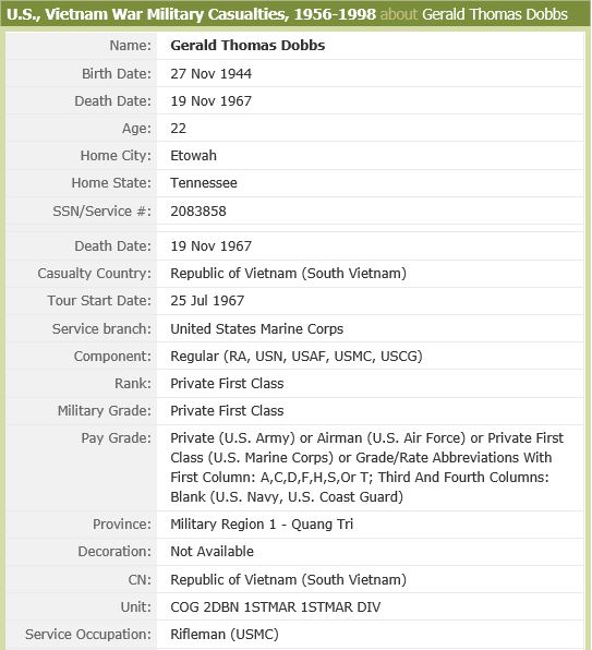 I remember well his death. We were on a patrol on Hill 31 about 20 clicks south of Quang Tri. We had found a lot of land mines there, and had blown them in place. I can’t remember now how many – a couple of dozen or so I guess. So many that the First Division newspaper propaganda sheet did a story on it. Anyway we were walking down a trail in the late afternoon. We were in single file coming back from a place we had just cleared of mines. Dobbs stepped to the side to take a photograph of the unit, and he tripped an anti-tank mine.