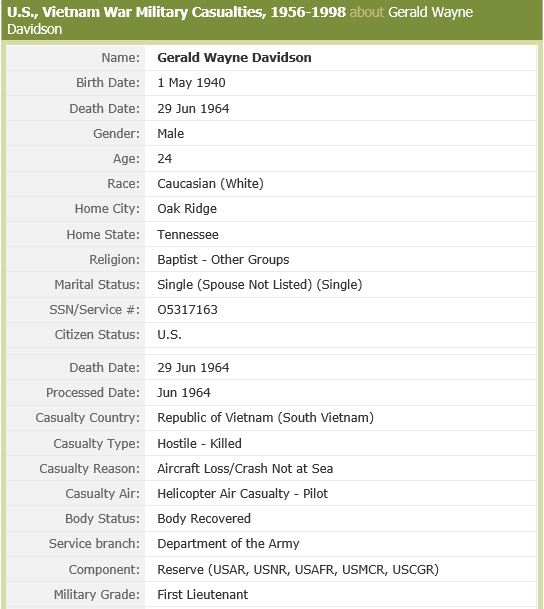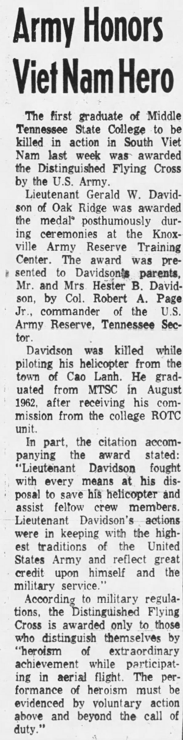 Gerald Wayne Davidson was killed while piloting his helicopter from the town of Cao Lanh. He graduated from Middle Tennessee State University in August 1962, after receiving his commission from the college ROTC unit. The Distinquished Flying Corss was awareded to him posthumously. In part, the citation accompanying the award stated: “Lieutenant Davidson fought with every means at his disposal to save his helicopter and assist fellow crew members. Lieutenant Davidson’s actions were in keeping with the highest traditions of the United States Army and reflect great credit upon himself and the military service.”