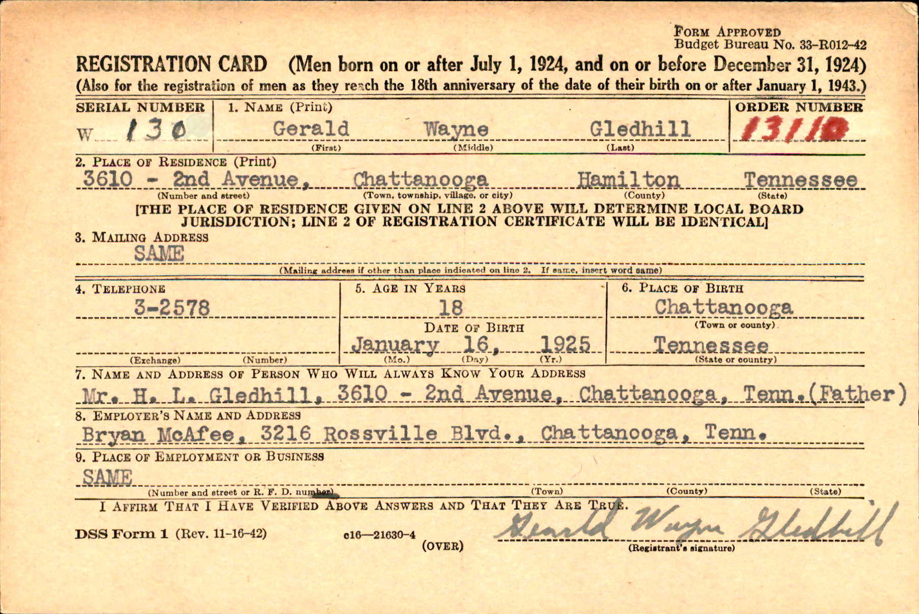 Gerald Wayne Gledhill was born on 16 January 1925 at Chattanooga, Tennessee, the son of Horace Leslie Gledhill and Edna Lee Heffner.
