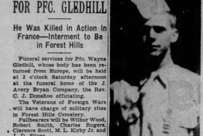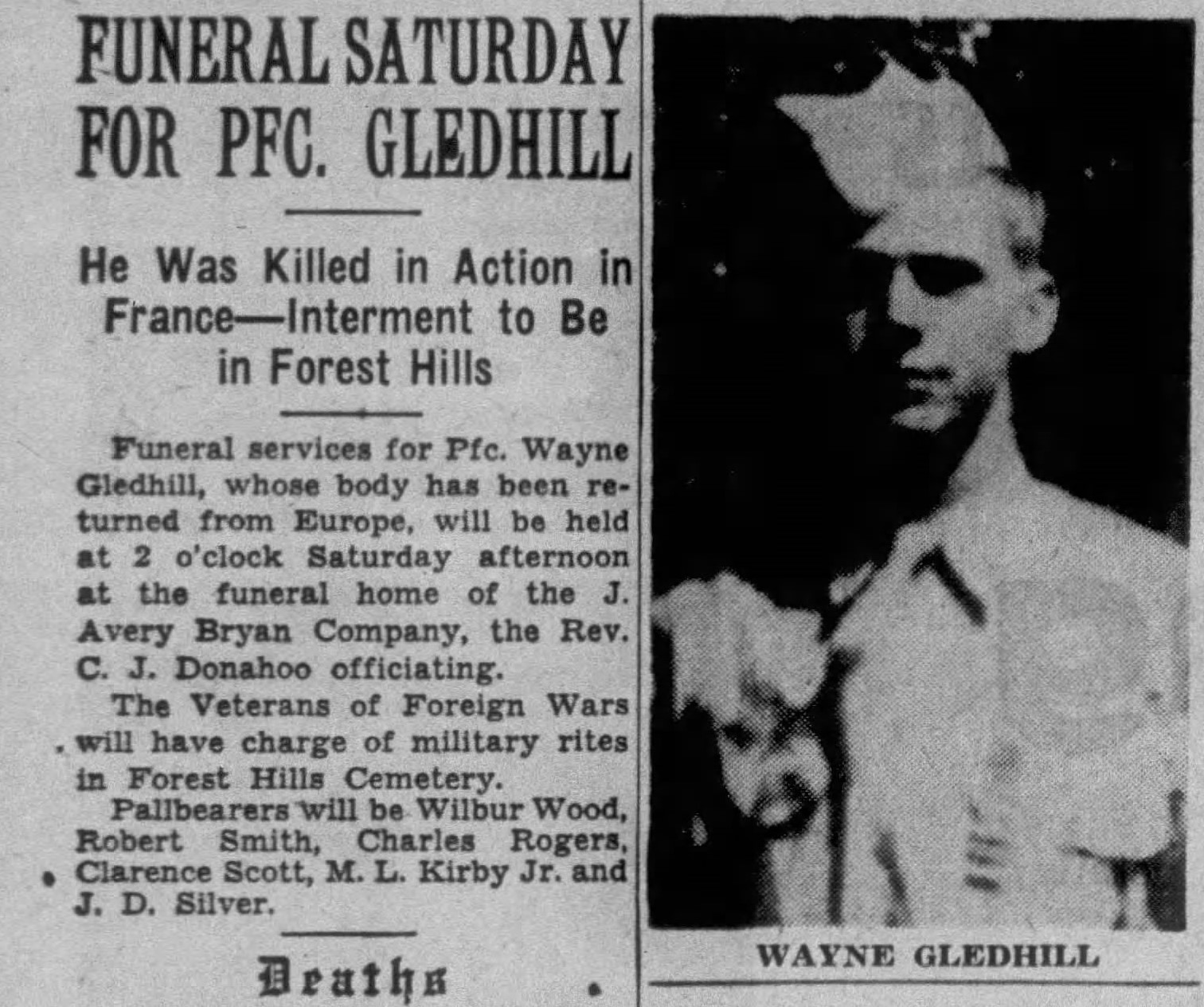 Pfc. Gerald Wayne Gledhill, son of Mr. and Mrs. H.L. Gledhill, 3610 Second Avenue, was reported missing in action yesterday by the War Department, according to word received by his family. He has been missing since July 12, his father said. He entered the army a year ago and had been overseas since January of this year. He received his basic training at Fort McClellan, Ala. His brother, Clarence Gledhill, is now stationed at Spence Field, Moultrie, Ga.