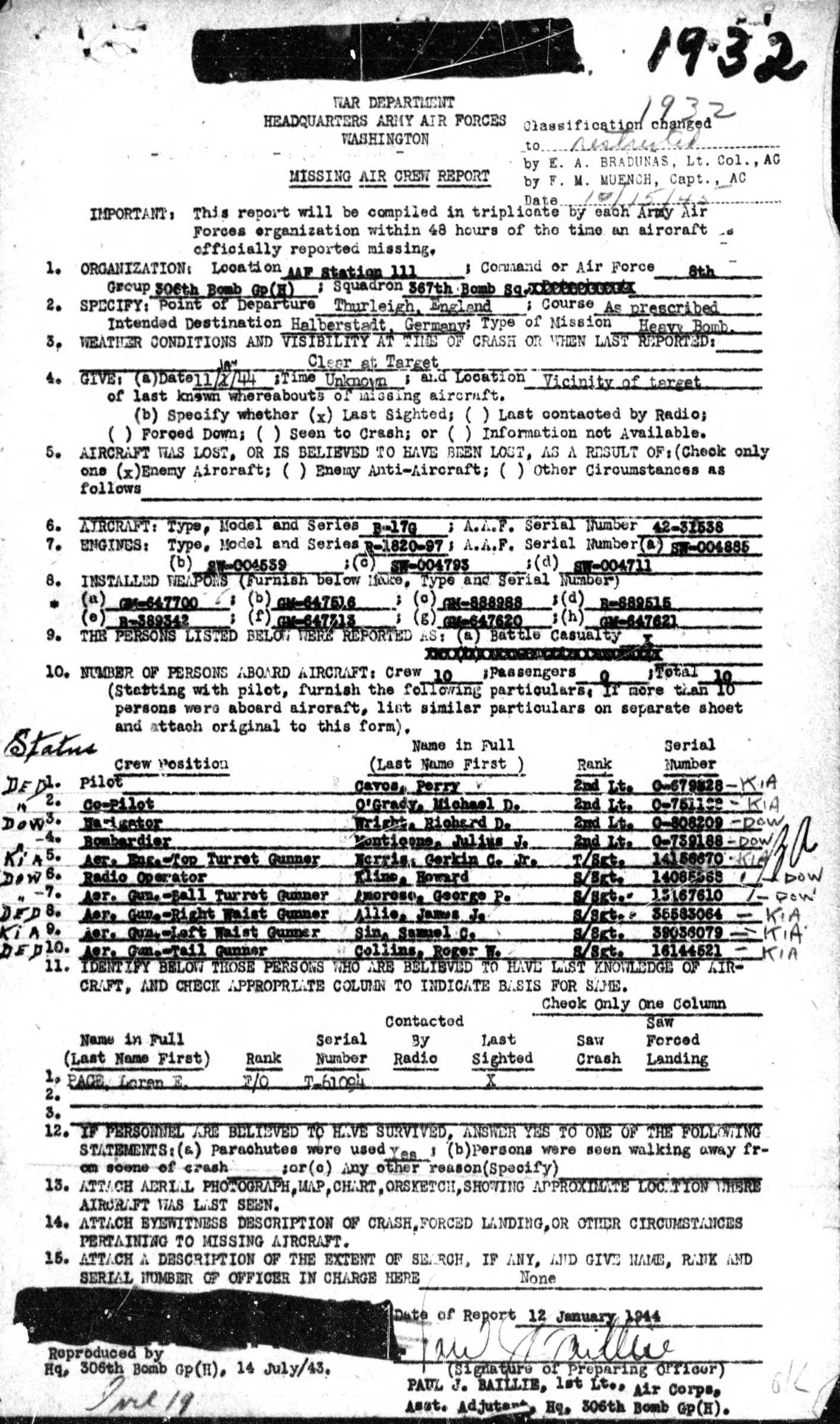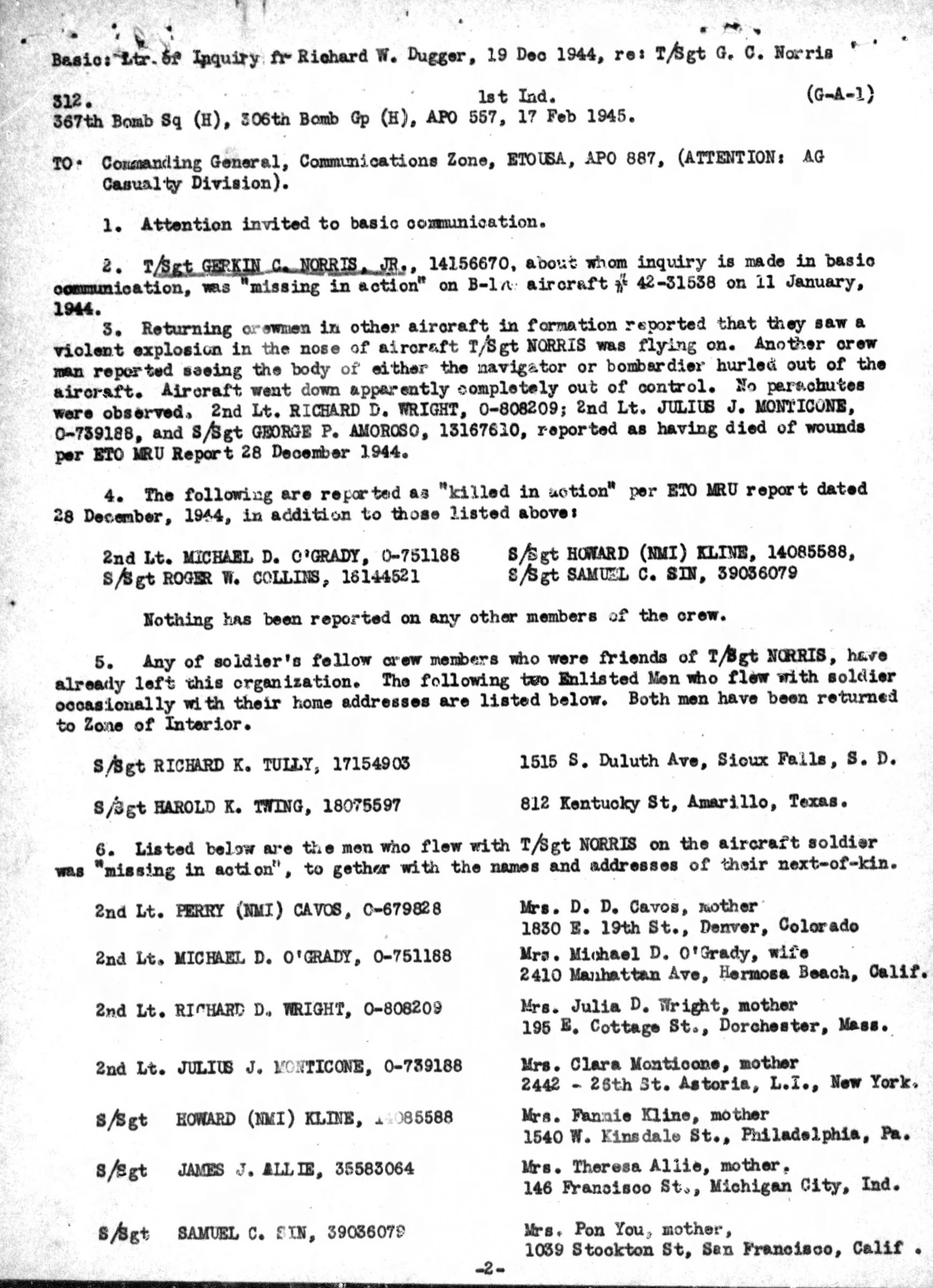 Sgt. G. C. Norris, previously reported missing in action since January 11th, following an air raid on Germany was reported killed in action on the same date, the War Department notified his parents last Thursday