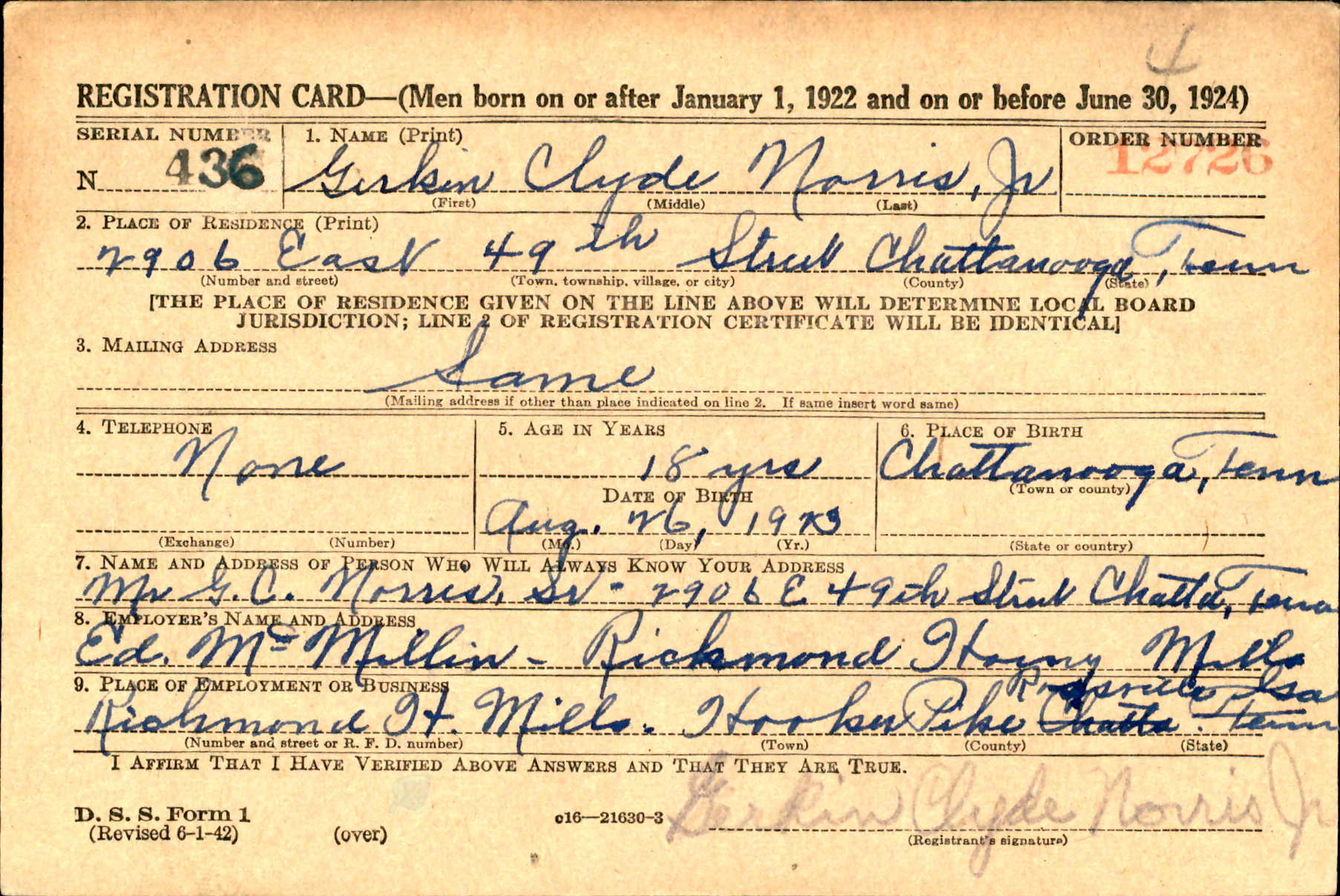 He volunteered for army duty in September 1942, while employed at the Richmond Hosiery Mills in Rossville. He served as a flight engineer aboard a B-17 Flying Fortress, and went overseas in October 1943. Sgt. Norris was a graduate of East Lake Junior High School, and attended Chattanooga Vocational High School two years. He was widely known in the East Lake and Rossville community. He is survived by his parents, Mr. and Mrs. Gert C. Norris, one brother, James Doc Norris, four sisters, Mrs. O. B. Stewart, Savannah, GA; Mrs. Charles Petetz, Lakeview, GA; Misses Mary Jo and Imogene Norris of Chattanooga.