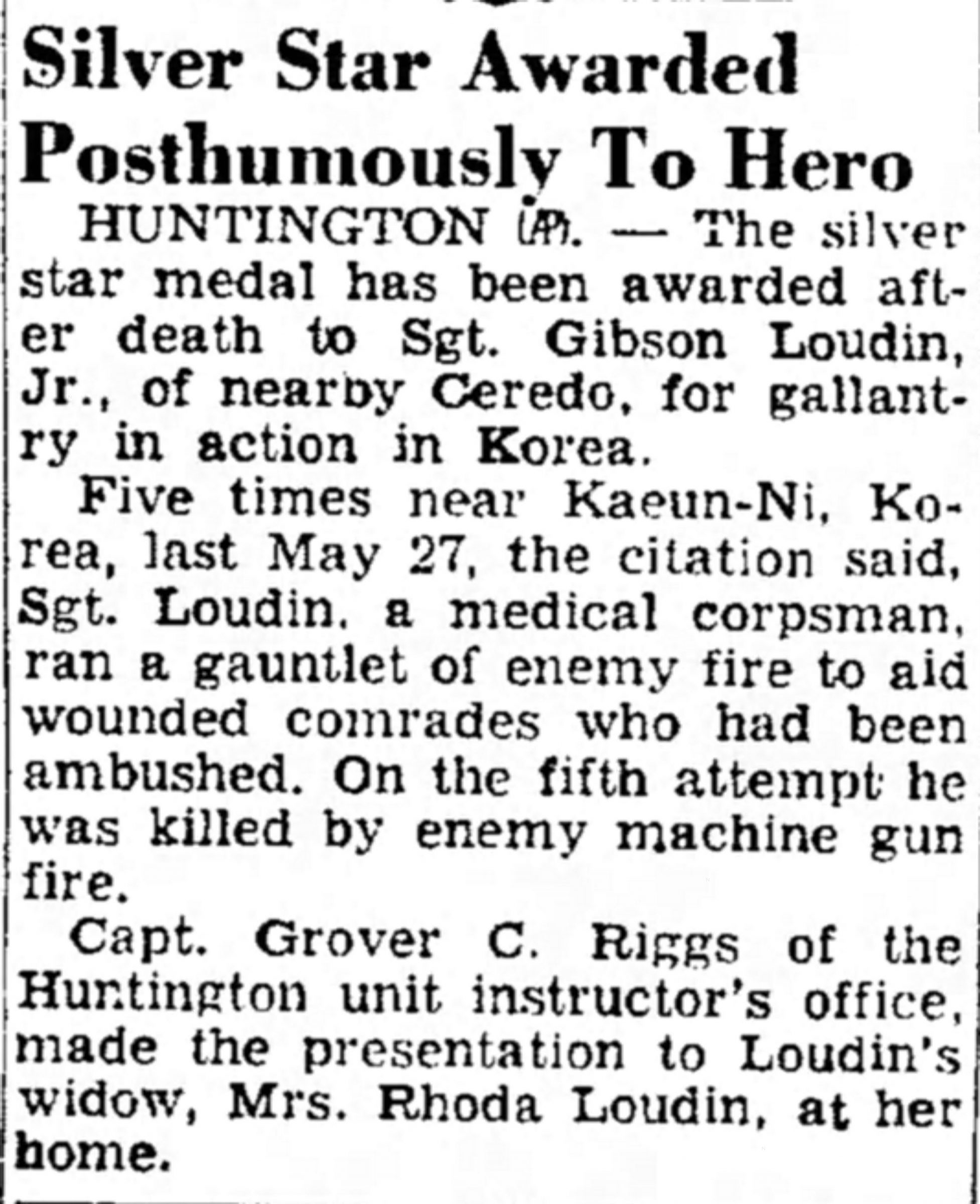 Sergeant Loudin was a medic with the Medical Detachment, 2nd Engineer Combat Battalion, 2nd Infantry Division. He was Killed in Action while tending his wounded comrades in North Korea. He was awarded the Silver Star posthumously.