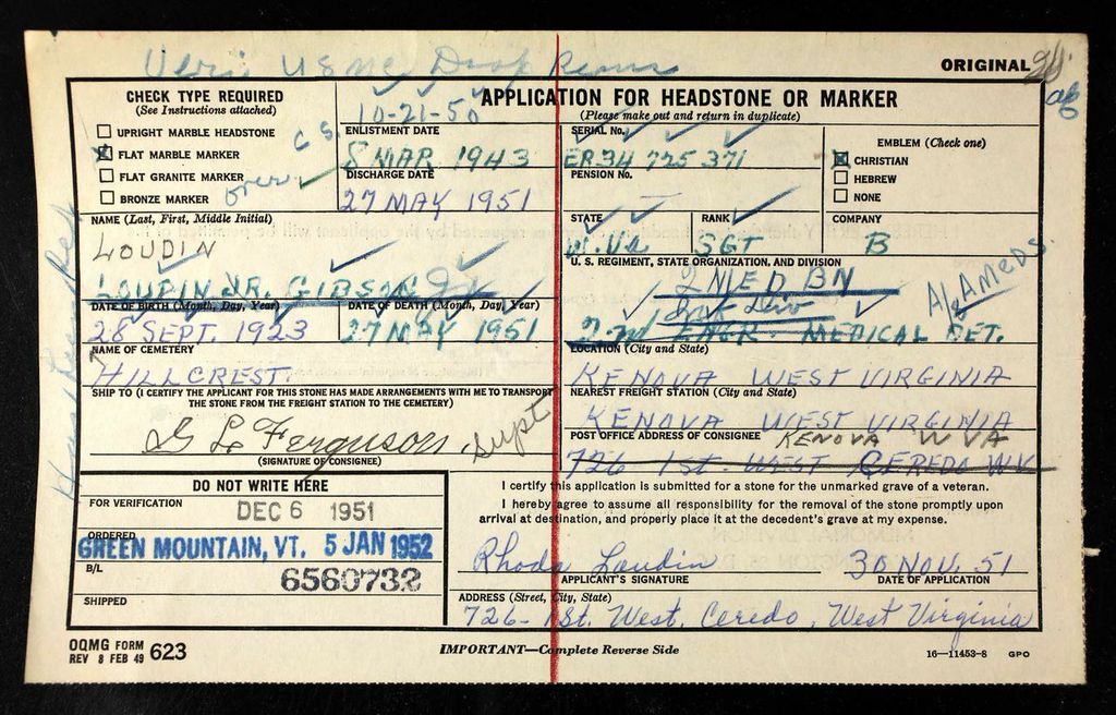 Gibson Loudin was born in Newcomb, Tennessee, son of Gibson Loudin and Martha Elizabeth Allen. He married Rhoda Perry on 25 September 1950 in Lucas, Ohio.