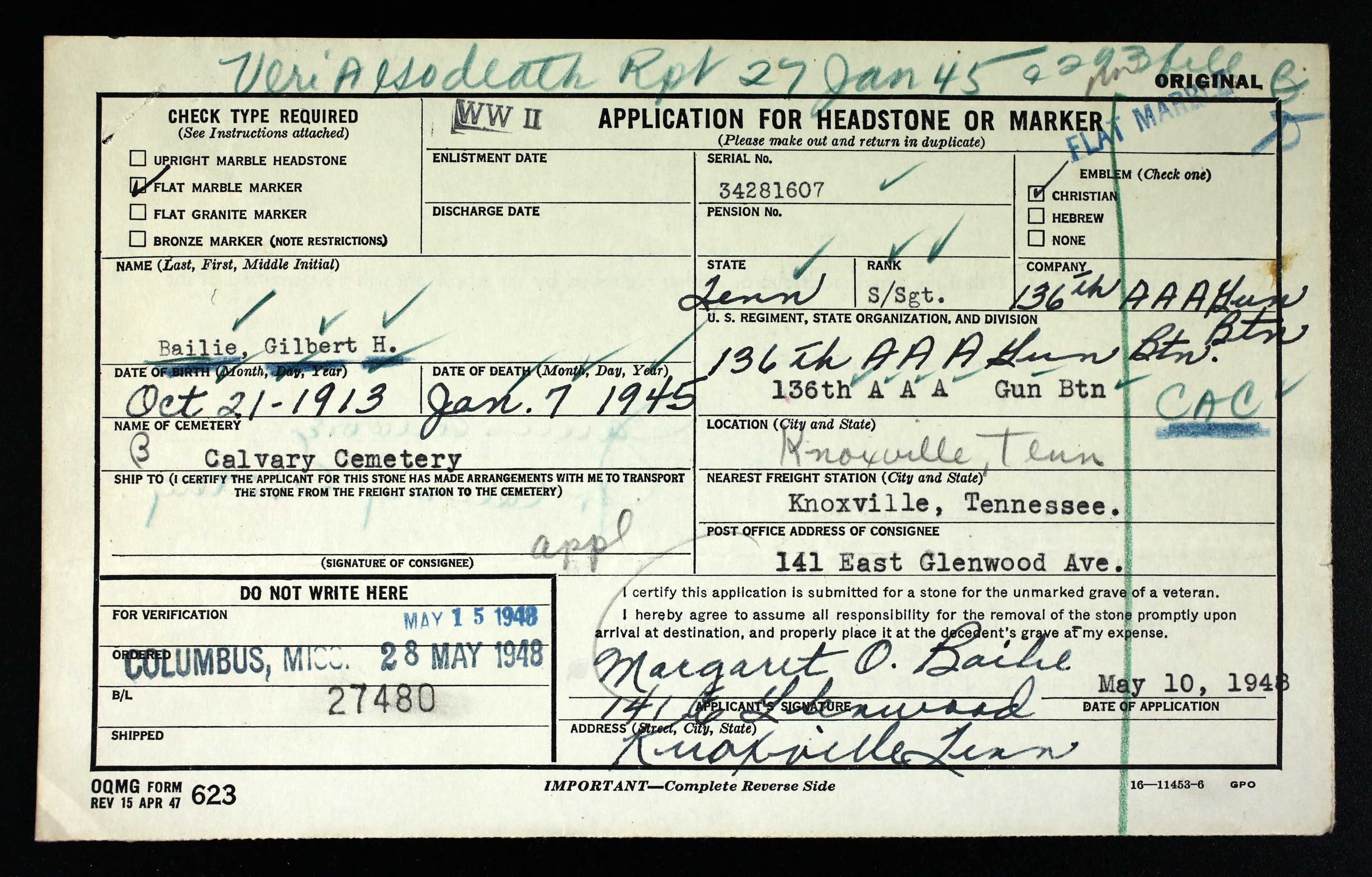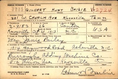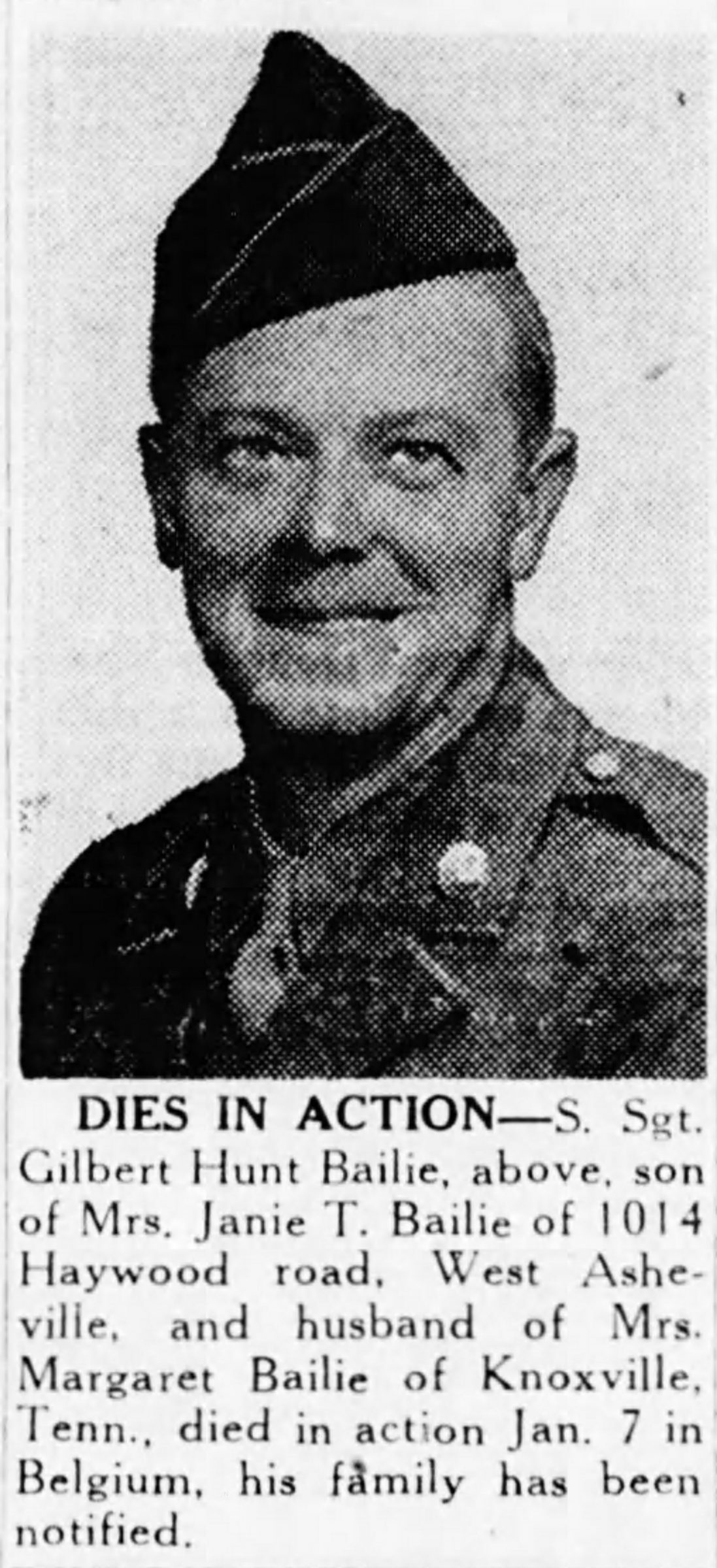 Staff Sergeant Gilbert Hunt Bailie, Jr. was born on October 21, 1913 in Haywood County, North Carolina. He was the son of Gilbert Hunt Bailie and Janie Hamilton Thompson Bailie. In 1930, he was living in a boarding house in Beaverdam, Haywood County, North Carolina with his mother, who worked as a bookkeeper at Fisher Mill. Sometime prior to joining the military, Staff Sergeant Bailie moved to Knoxville. He also received one year of college education. He enlisted in the military on April 18, 1942 in Fort Oglethorpe, Georgia. He served in the European theater of the war and was killed in action in the Battle of the Bulge on January 7, 1945. He is buried in Calvary Catholic Cemetery in Knoxville.
