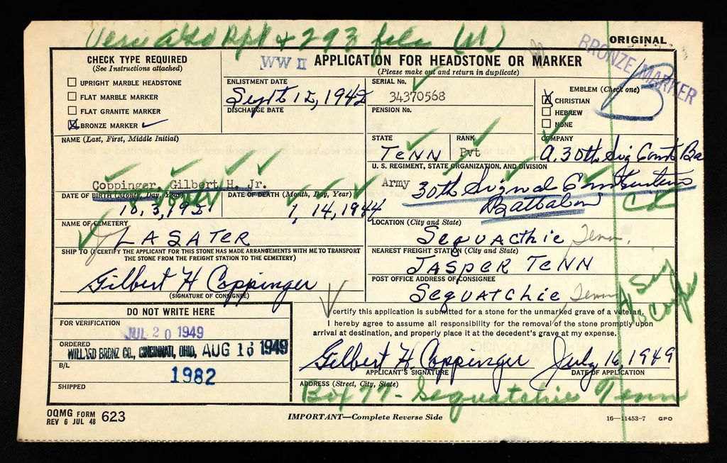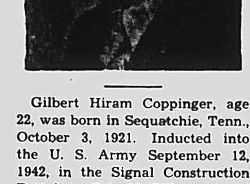 Gilbert Hiram Coppinger, age 22, was born in Sequatchie, Tenn., October 3, 1921. Inducted into the U.S. Army September 12, 1942, in the Signal Construction Battalion, C.A. 30 Gilbert served in North Africa, Sicily and Italy. Injured January 6, 1944 in Naples, Italy. Died January 14, 1944.